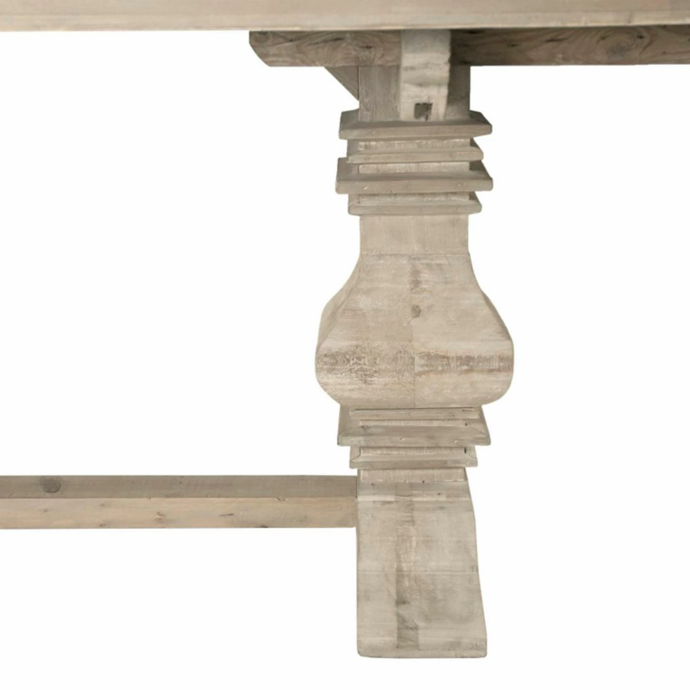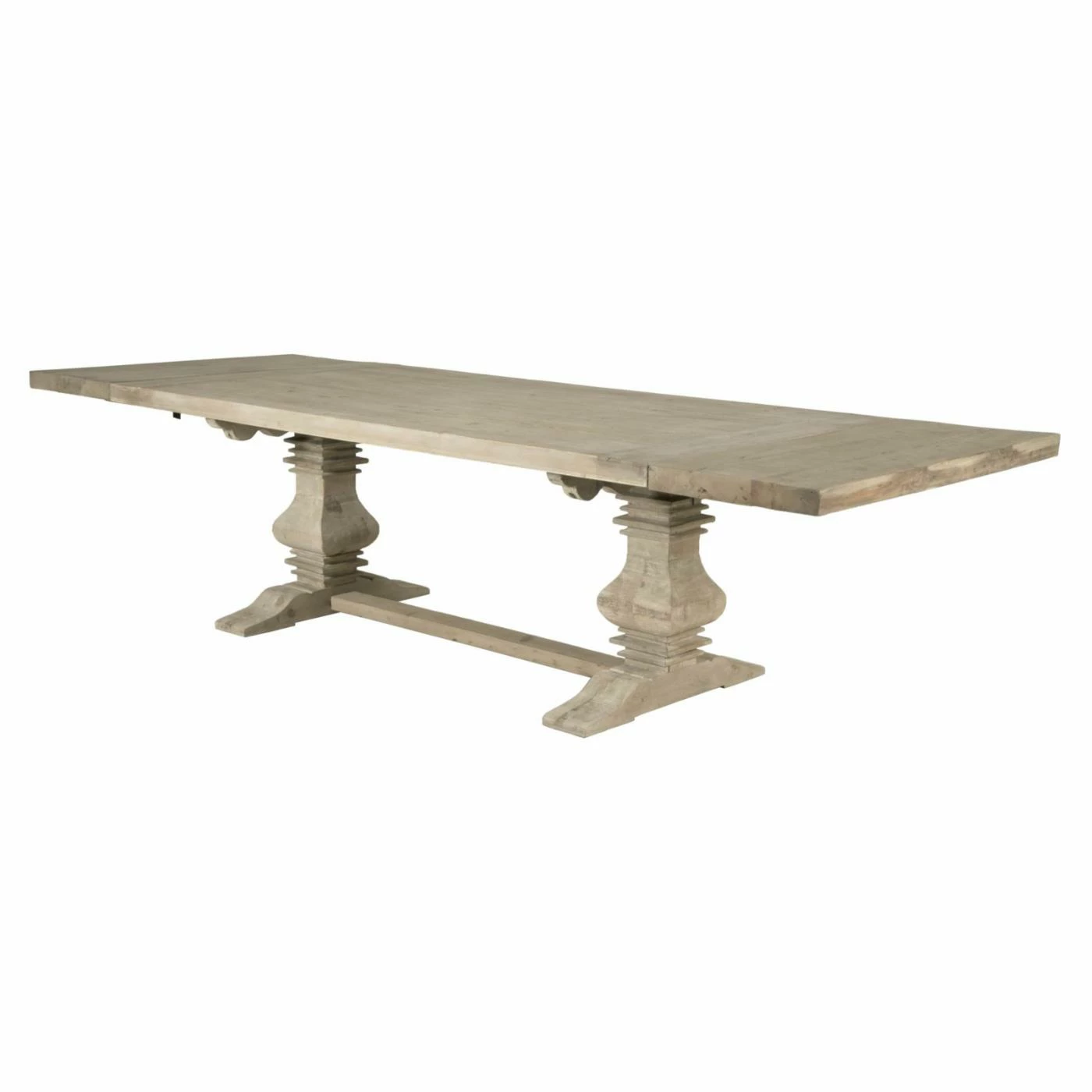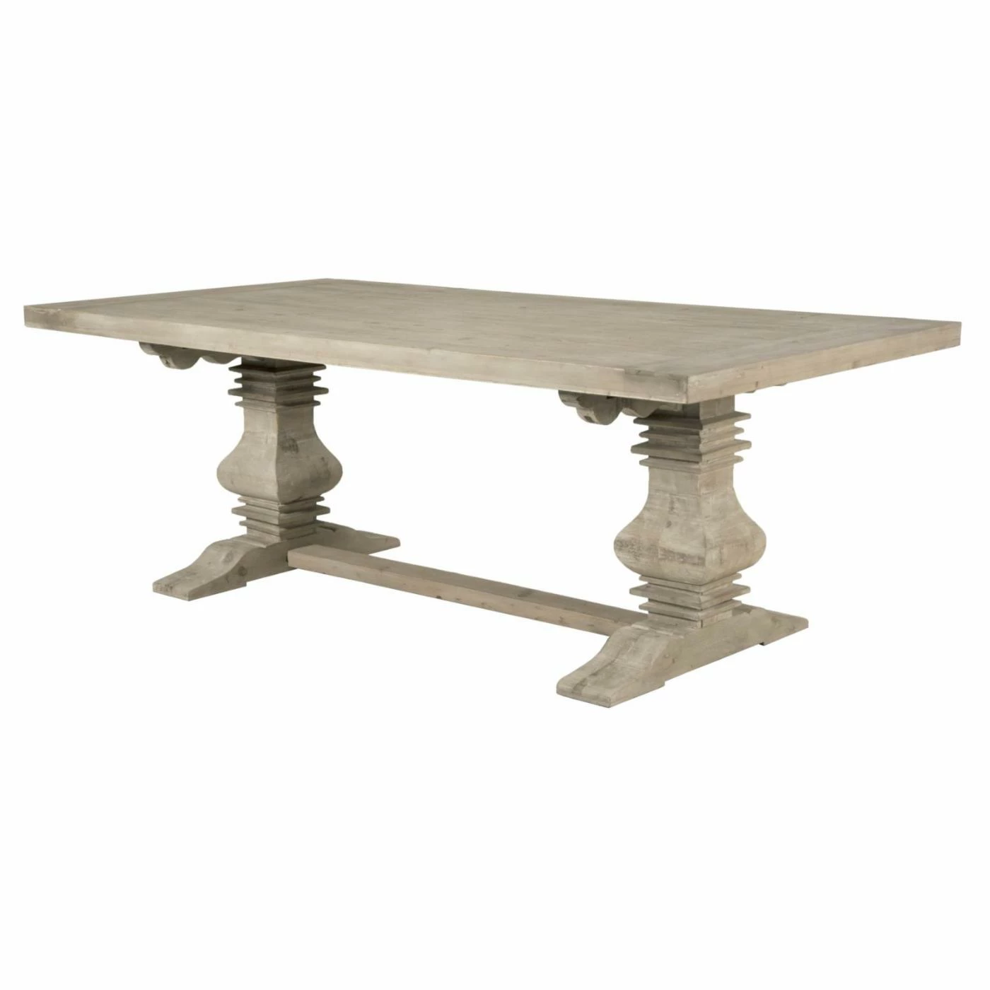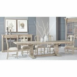 Make family dinners something to remember with the Orient Express Furniture Bella Antique Monastery 5 Piece Dining Set with Colette Dining Chairs. This beautiful dining set includes a rectangular table and four matching chairs, each featuring a simple transitional design carved from fine European pine hardwood. A carved trestle base supports the table, making even simple meals feel like a grand feast. Each chair comes with a graceful violin-style open back and a foam-padded seat, upholstered in white fabric. The chairs are finished in beige while the table is finished in a smoke gray. Two extension leaves are included to expand the table’s surface for special occasions.