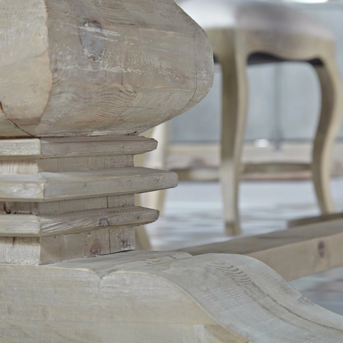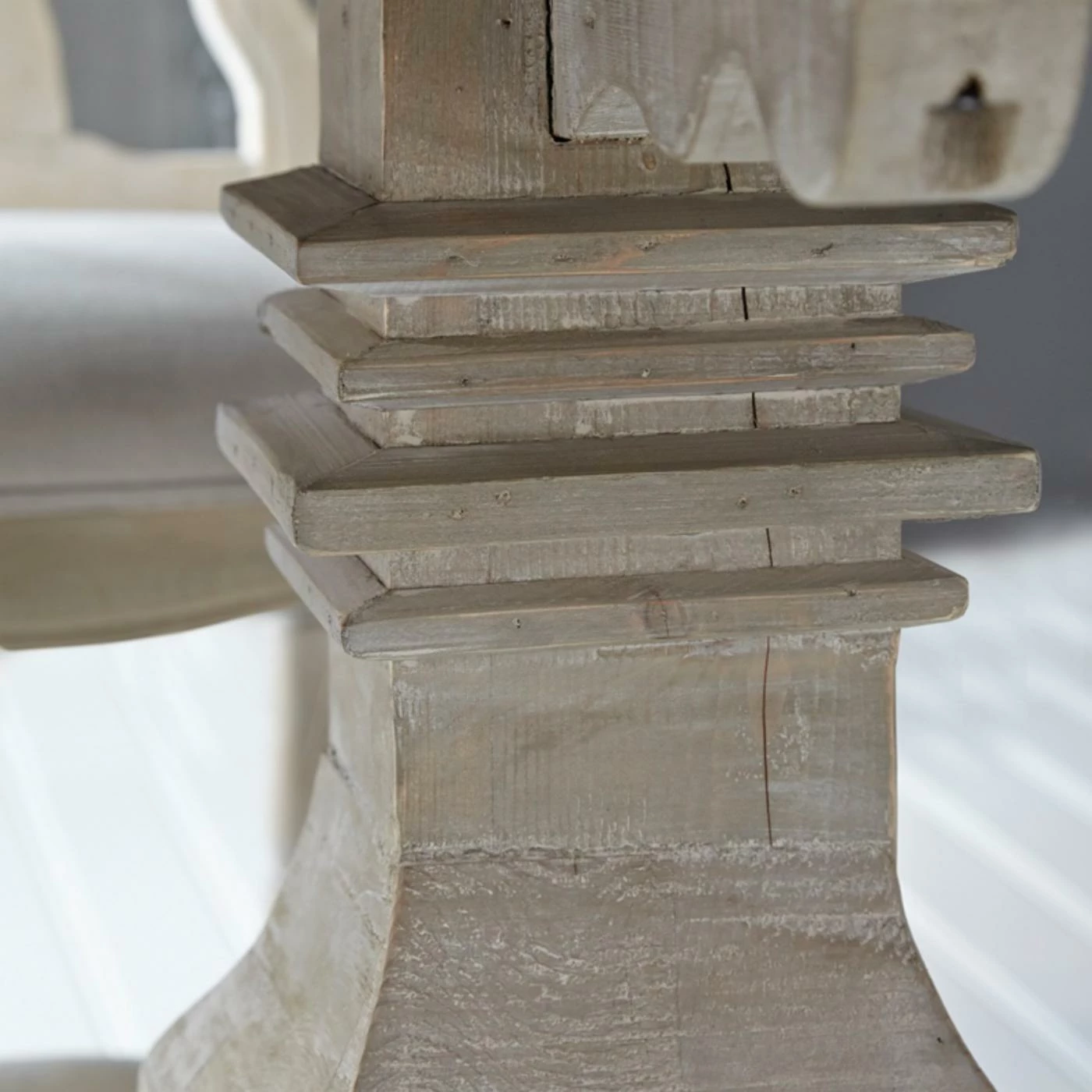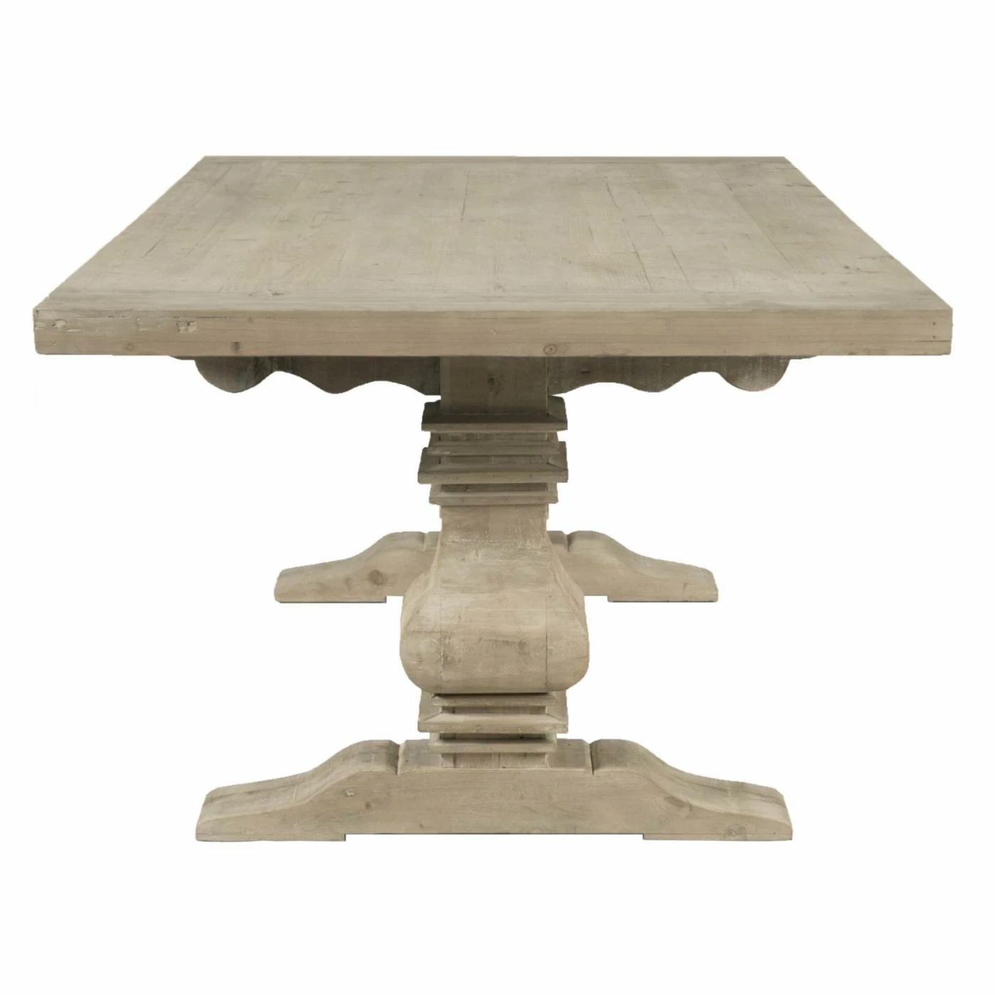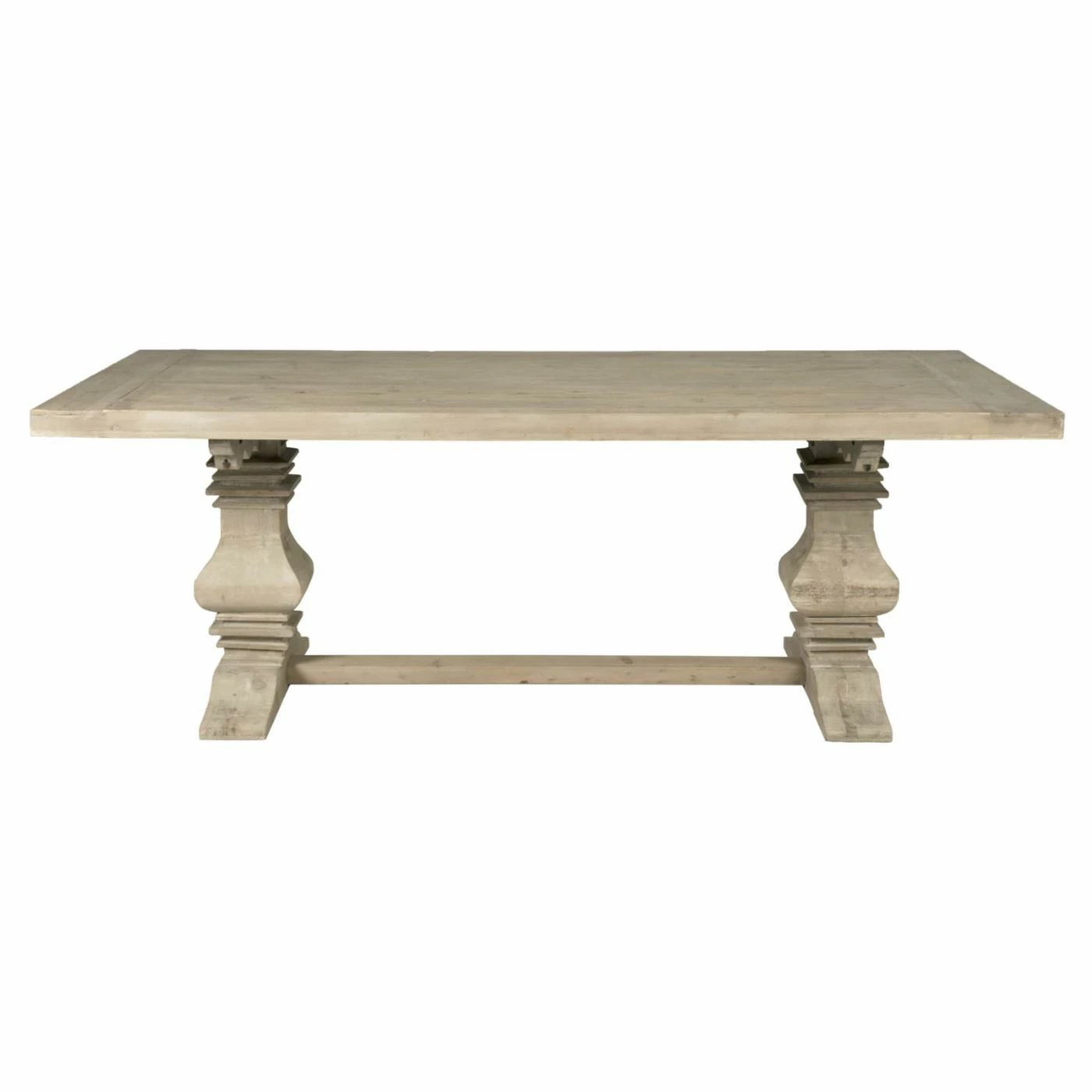 Make family dinners something to remember with the Orient Express Furniture Bella Antique Monastery 5 Piece Dining Set with Colette Dining Chairs. This beautiful dining set includes a rectangular table and four matching chairs, each featuring a simple transitional design carved from fine European pine hardwood. A carved trestle base supports the table, making even simple meals feel like a grand feast. Each chair comes with a graceful violin-style open back and a foam-padded seat, upholstered in white fabric. The chairs are finished in beige while the table is finished in a smoke gray. Two extension leaves are included to expand the table’s surface for special occasions.