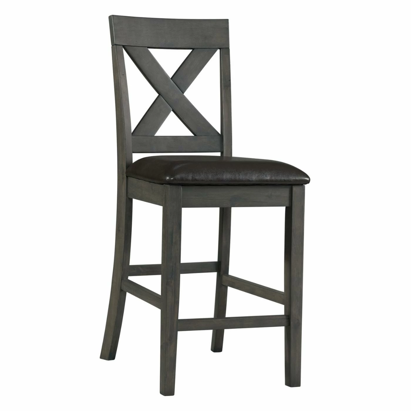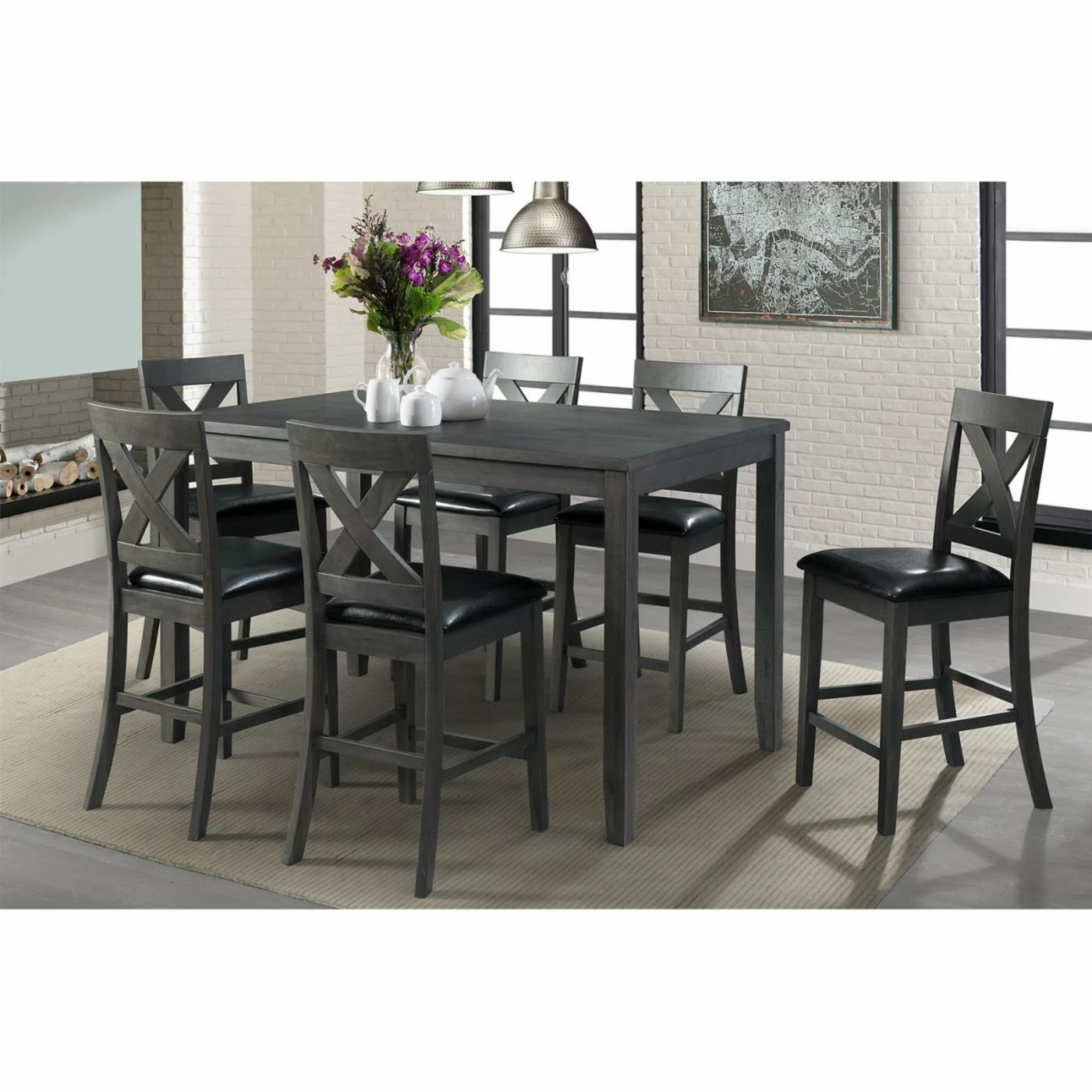 Elevate dining in your home with the Picket House Furnishings Alexa 7 Piece Counter Height Dining Set. This dining set is counter height for a contemporary take on a classic table. It is constructed with durable acacia wood solids and engineered wood. It is finished with mango veneers in a choice of color. The chairs are upholstered with black faux leather and padded with comfortable foam. A distinct X-style back adds contemporary charm to the chairs. Linger over your meals with friends and family at this inviting dining set.