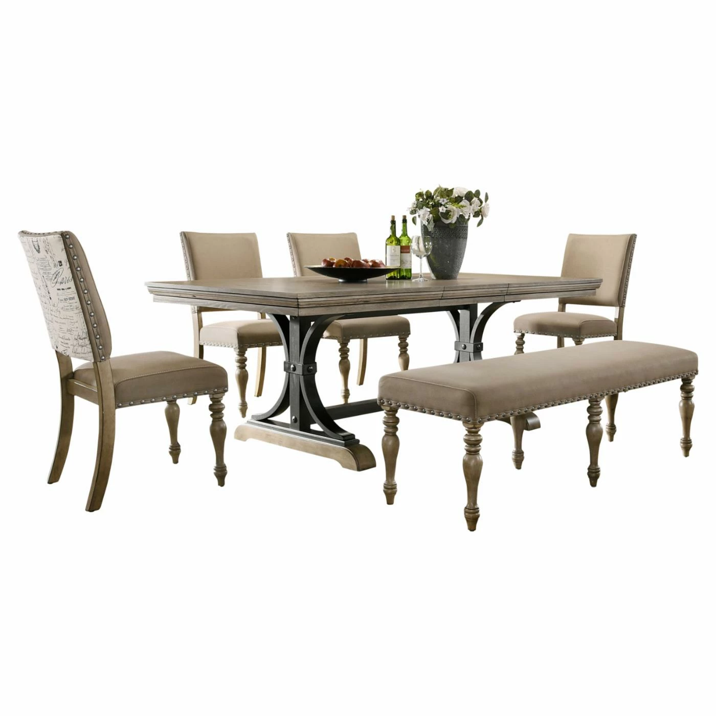 All of your friends and family will be invited to dinner with the Roundhill Furniture Birmingham 8 Piece Dining Set‘s included extension leaf. Turned and tapered legs mixed with the beige microfiber fabric upholstery of the seating in this set provides a sophisticated look. A black script pattern on the backs of the chairs and nailhead trim completes the elegance. The curved metal on the trestle base of the table adds a rustic touch to the otherwise classic design. This dining set includes a dining table, bench, and six coordinating chairs. Each piece in this set is constructed from solid rubberwood and oak veneers in a driftwood finish. Pair this set with other items from the Brimingham Collection for a complete look in your dining room.