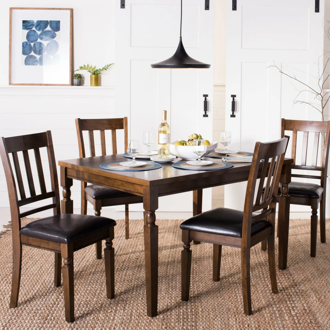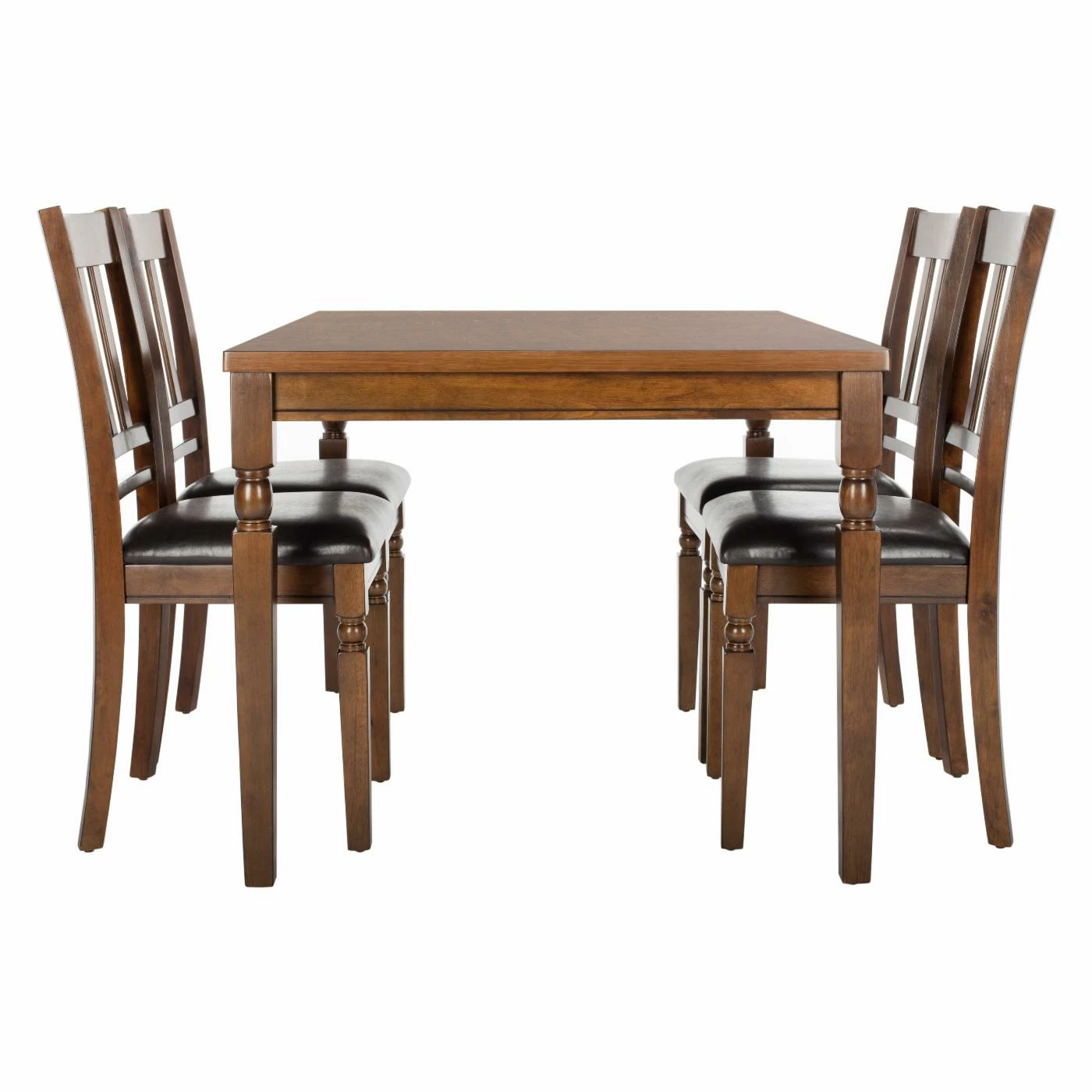 With the Safavieh Kodiak 5 Piece Dining Table Set, you can enjoy the beauty and strength of solid mango wood. This finely crafted set includes a clean-edge rectangular table with a light oak finish. It comes with matching chairs that have slatted backs and cushioned seats with faux leather upholstery. Plus, the chairs’ front legs have turned detail that matches the table’s legs.