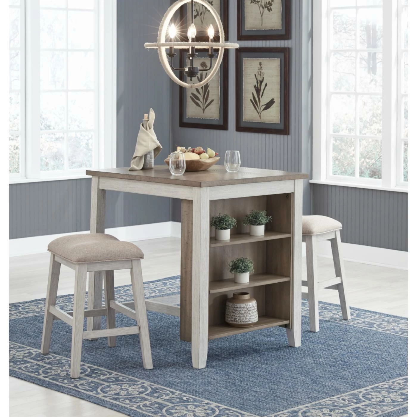 - Includes counter height table and 2 bar stools