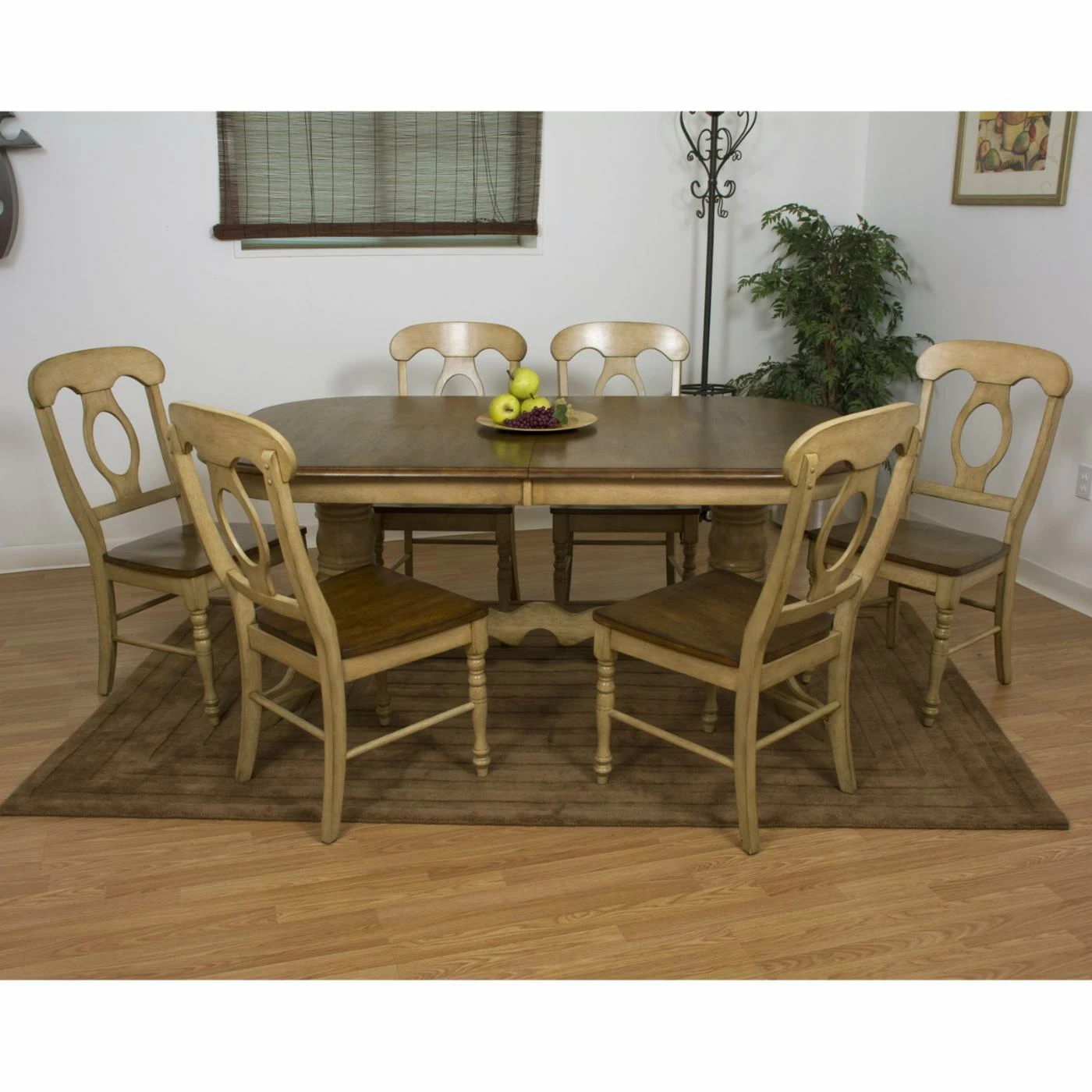 A classic dining table and chair set, this one is well-made of eco-friendly Malaysian oak with a two-tone finish. The double pedestal table base and chair frames are finished in distressed wheat. The tabletop and seats are finished in a contrasting warm pecan. The arched back with open oval and turned legs and pedestals make this set an ideal choice for you.