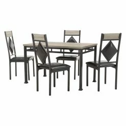 Give your dining room a traditional look with the Weston Home Olek 5 Piece Dinette Set. This compact dining set includes a rectangular table and four matching chairs. The seats and backrests are cushioned with foam and upholstered with black faux leather. The metal frames feature a black finish which contrasts with the light finish on the engineered wood components.