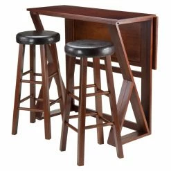 This three-piece set is constructed to last from solid wood. It comes in a warm walnut finish that works with classic or contemporary settings. The black faux leather is easy to maintain and always look new. The stools comes fully assembled and the table requires some assembly.