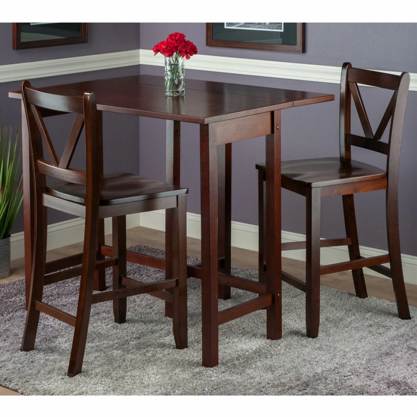 Smart and stylish, the Winsome Trading Lynnwood 3 Piece Counter Height Dining Table Set is a great addition to any home. This three-piece set includes practical drop leaf table and two coordinating stools. All pieces are constructed from solid and composite wood and come in a friendly antique walnut finish that blends well with contemporary or classic settings. This versatile high table is designed to save space in style. Its leaf folds down to tuck it out of the way when not in use. When guests arrive, pull-up the extension and double your worktop surface. It accommodates two when folded and four when extended. The chairs are graced with transitional V-back detailing, contoured seats, and stretcher bars that double as footrests. Assembly required for both table and chairs.