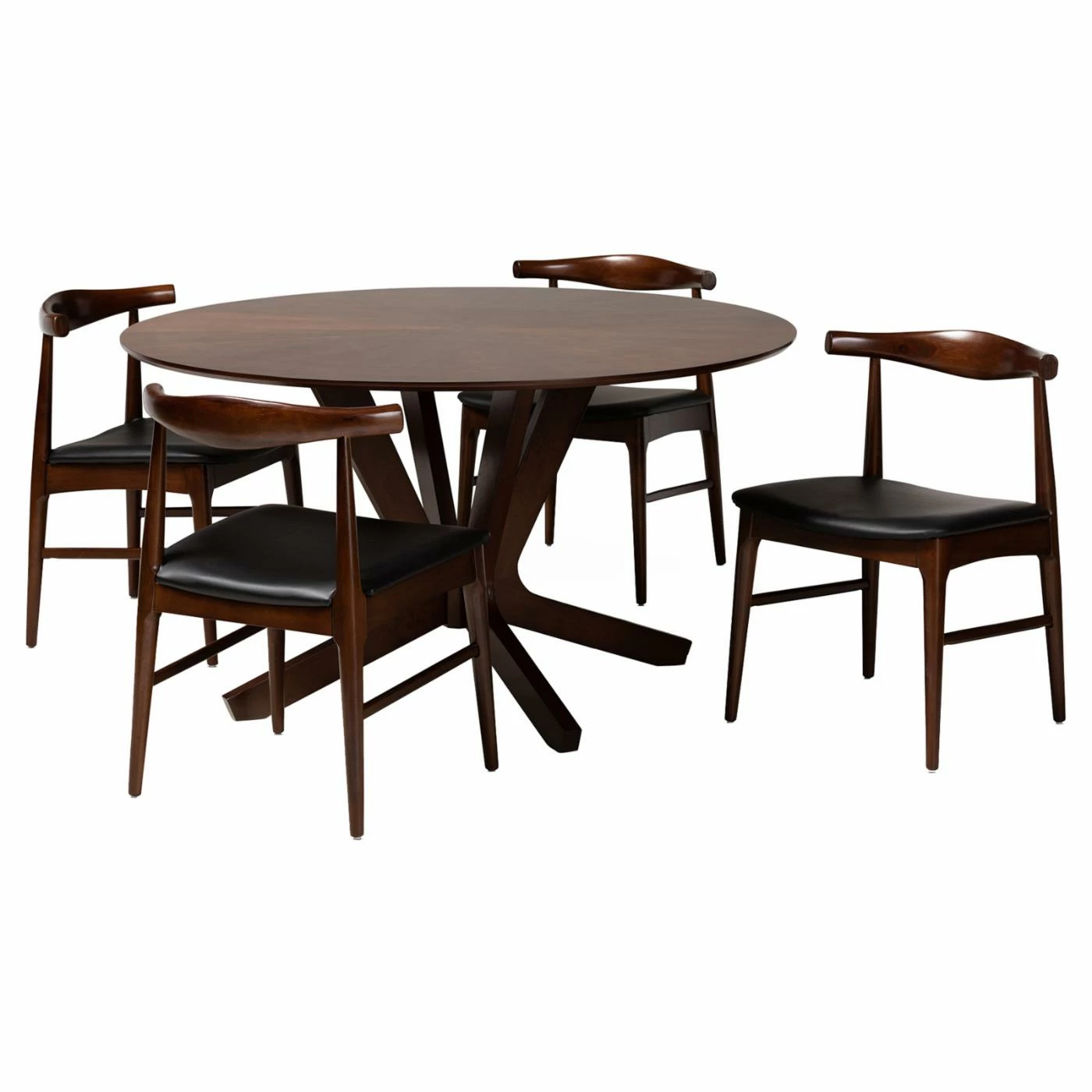 Ready or a change of scenery? The Baxton Studio Berlin 5 Piece Dining Set features bold lines and even bolder colors, making it a masterful one-stop way to outfit your kitchen or dining room for plenty of seating space. Four dining chairs and a round table are included in the set. The frames are constructed from solid rubberwood and engineered wood with a dark walnut brown finish. The table has a pedestal base with angled block legs. Soft foam pads the seat cushions, upholstered in black faux leather. An optional curved bench is offered to match (subject to availability).