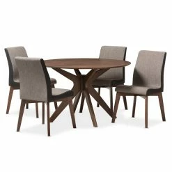 Introduce mid-mod style into your dining room with this Baxton Studio Kimberly 5 Piece Dining Set. The set includes a round dining table with angled, flared legs that form a pedestal base and four chairs with coordinating flared wooden legs. The five-piece dining set is built of rubberwood solids and wood veneers in a versatile walnut finish. Chairs are upholstered in soft, easy-care polyester in beige with brown sides.