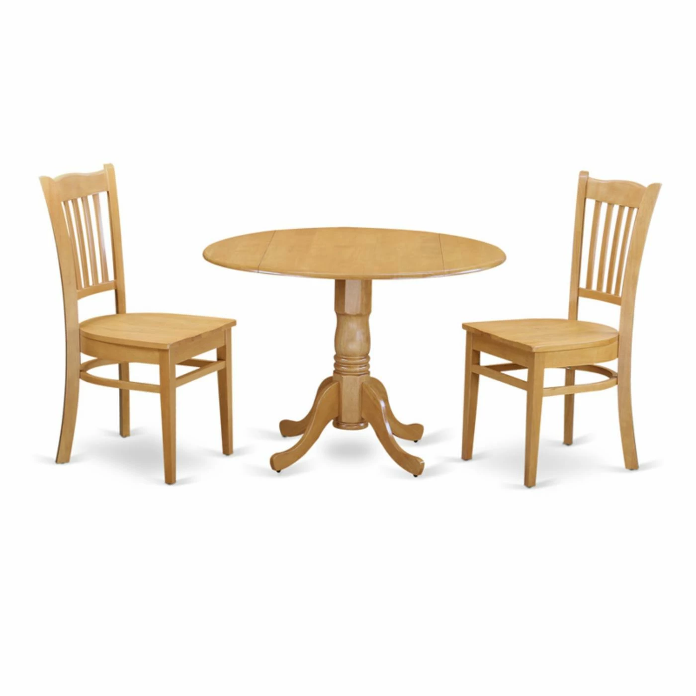 From its oak finish to its vertical slat chair backs, the East West Furniture 3 Piece Comb Back Drop Leaf dinette Dining Table Set is a great way to dress up your compact dining area. The two chairs and round table and crafted of 100% Asian hardwood with no MDF, veneers, or laminate. Two 9-inch drop leaves on the table can be raised or lowered as needed, and the turned pedestal base channels classic design with its four shaped feet.