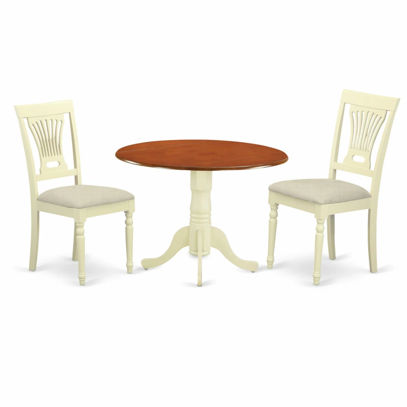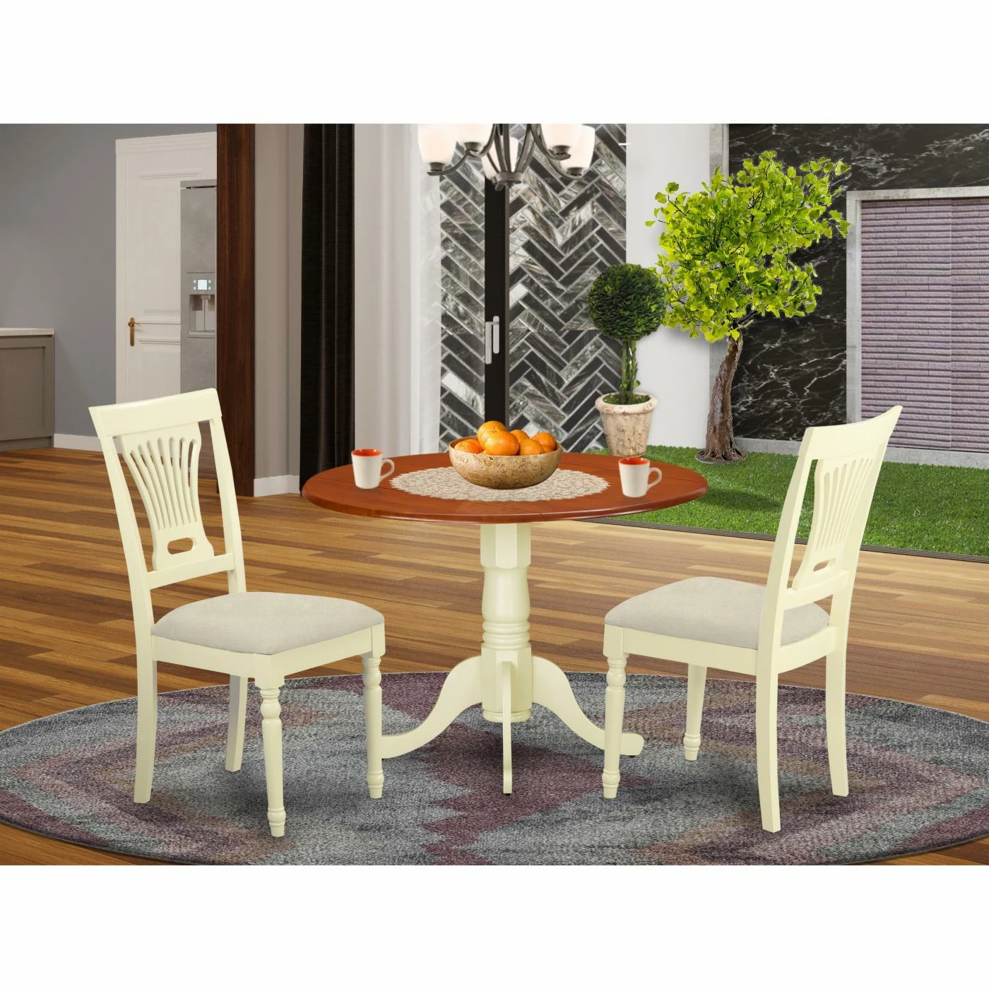 Stylish details on the East West Furniture 3 Piece Empire Drop Leaf Dinette Dining Table Setadd up to your new favorite place to enjoy a morning coffee or a quick midnight snack. The traditional splat backs on the chairs pair with linen seats, while the table has a turned pedestal base with stylish feet as well as two 9-inch drop leaves. Each piece is crafted of Asian hardwood in a choice of finish that uses no MDF, particleboard, or laminate.
