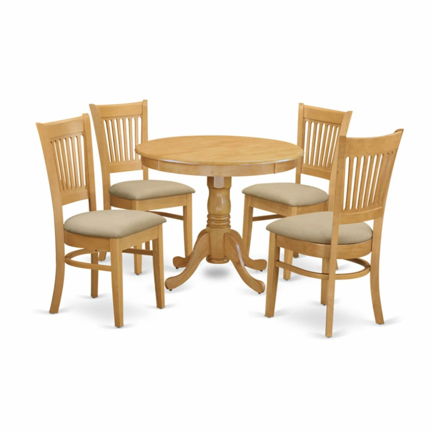 From breakfast to dinner and everything in between, the East West Furniture 5 Piece Hepplewhite Modern Kitchen Dinette Dining Table Set creates a casual, charming gathering spot in your kitchen or dining room. With a light oak finish, this dining set comes complete with a round table and four chairs. They’re crafted of 100% Asian hardwood that uses no MDF, veneers, or laminate, and the chairs pair vertical slat backs with your choice of seat type. The table has a beveled edge along the top, plus a traditional turned pedestal base with four shaped feet.