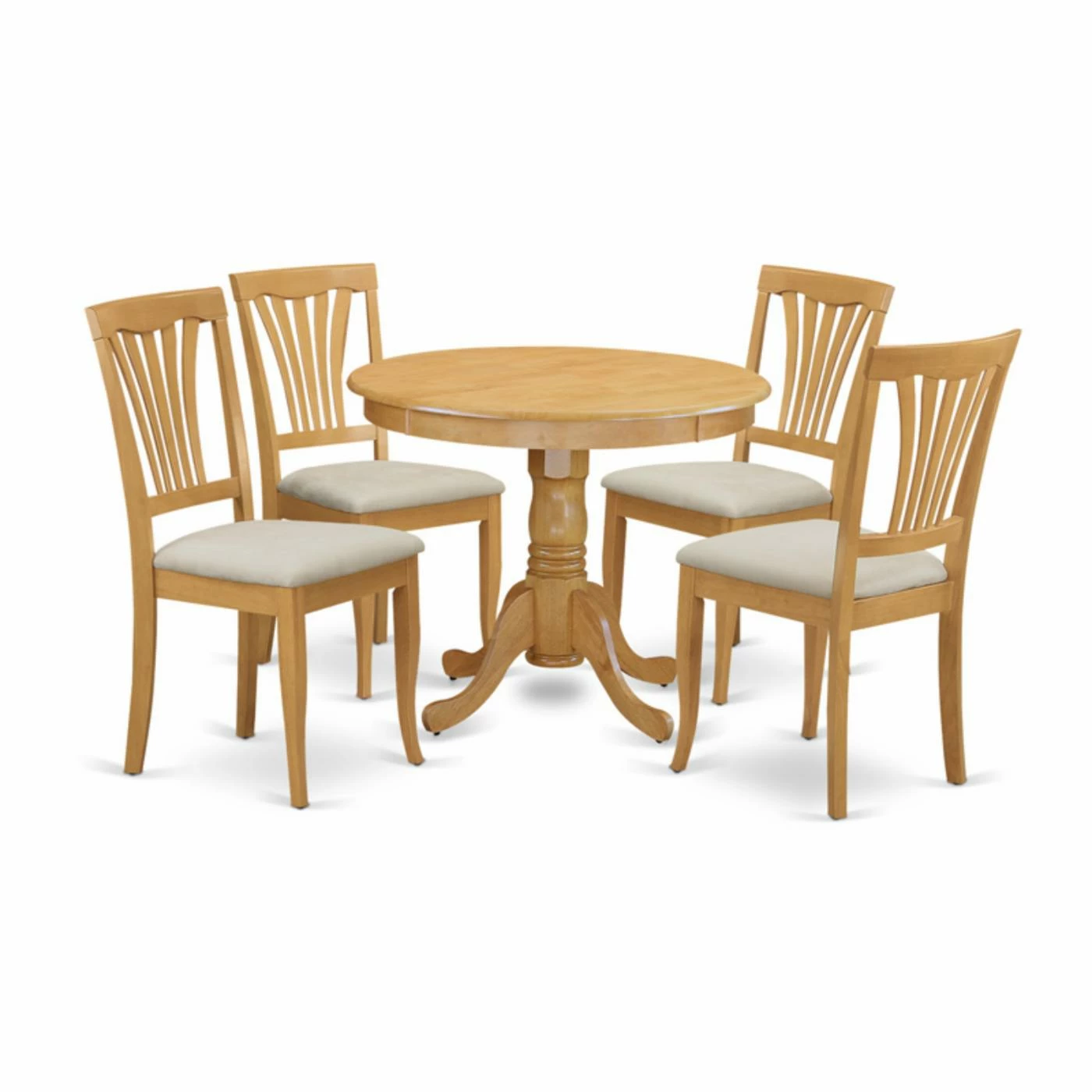 Dining is a delight with the East West Furniture 5 Piece Lath Back Kitchen Dinette Dining Table Set and its classic charm. Crafted of 100% Asian hardwood with no fiberboard, veneer, or laminate, this dining set includes a round table and four chairs. The table has a turned base below and a beveled edge along the top, while the chairs have an open lath-style back and cozy microfiber upholstery on the seats.