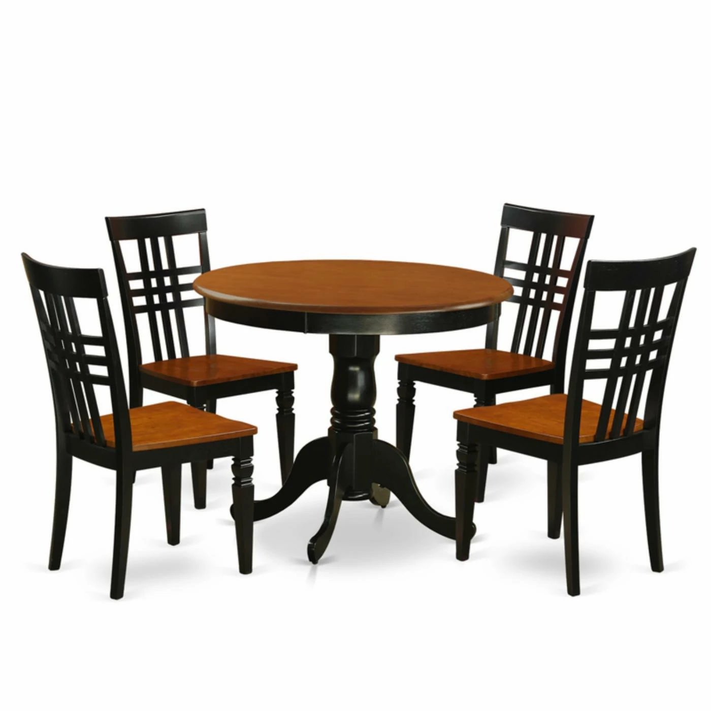 Even that leftover lasagna looks pretty inviting when the East West Furniture 5 Piece Triple Crossback Kitchen Dinette Dining Table Set is part of your kitchen or dining room. Coming complete with a round table and four chairs, this dining set is available in your pick of finish and is crafted of 100% Asian hardwood, using no MDF, veneer, or laminate. The triple cross design on the chair backs add visual appeal, especially when paired with the turned front legs. On the table, you’ll find a beveled edge along the top as well as a turned pedestal base with four shaped legs.