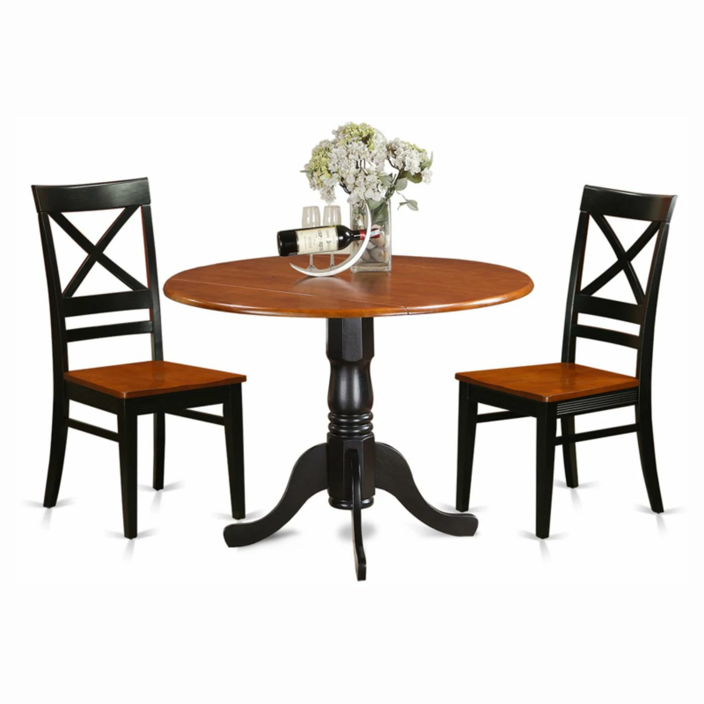 With its X-back chairs and two-toned finish, this East West Furniture Dublin 3 Piece Drop Leaf Dining Table Set with Quincy Wooden Seat Chairs is an updated take on a farmhouse classic. The dining set includes two chairs and a pedestal table crafted of solid Asian hardwoods in your choice of two-toned finish. The table’s two 9-inch drop leaves open independently to accommodate more guests when needed.