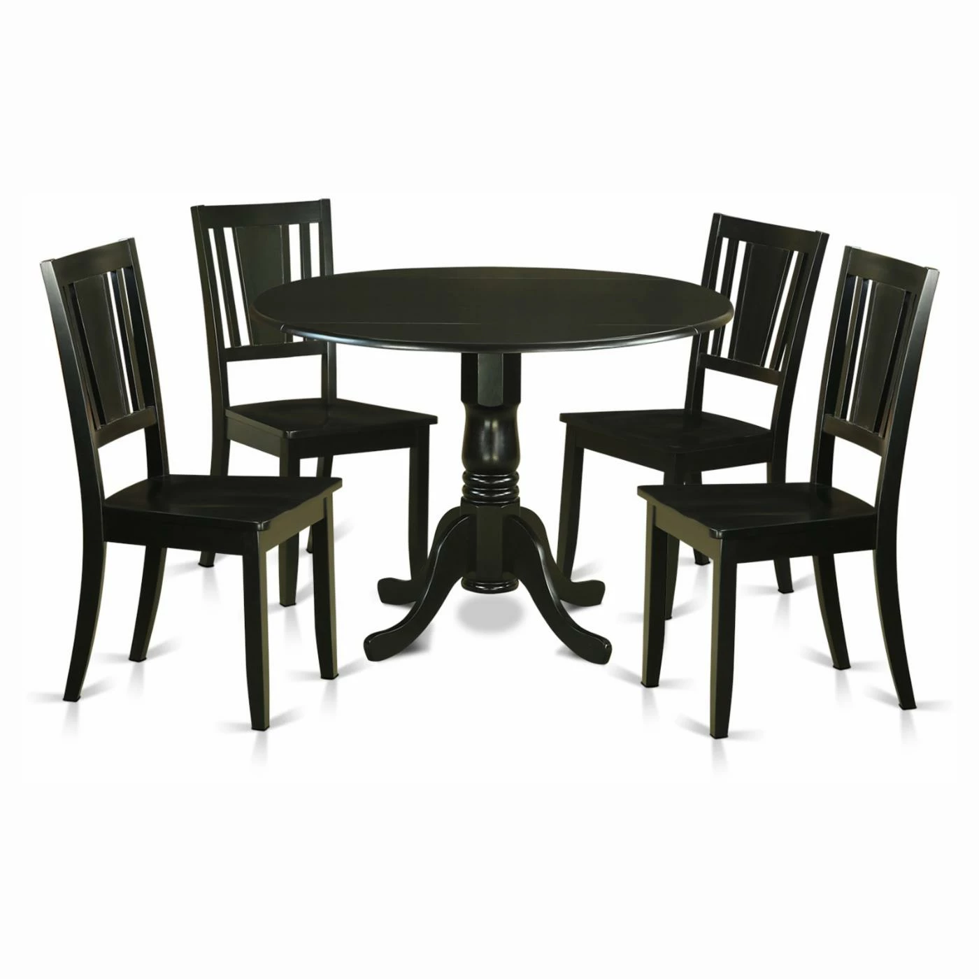 Style meets structure with the tailored look of the East West Furniture Dublin 5 Piece Drop Leaf Dining Table Set with Buckland Wooden Seat Chairs. This set includes a round drop-leaf table with classic turned pedestal base, and four stylized slat-back chairs. The striking black finish adds a dramatic flair – just right for your well-appointed dining room. Assembly required.