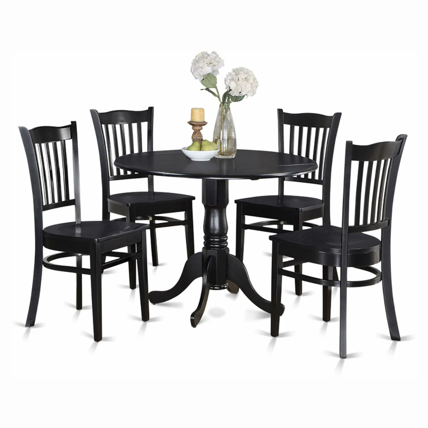 Give your dining room a charming place to gather with the East West Furniture Dublin 5 Piece Drop Leaf Dining Table Set with Groton Wooden Seat Chairs. This set includes a round drop-leaf table with classic turned pedestal base, and four slat-back chairs. Traditional design elements with timeless appeal make this a favorite set. Choose from available finishes. Assembly required.