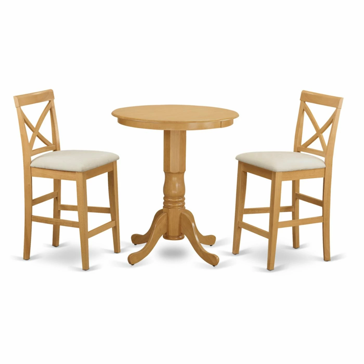 Sleek lines bring modern-chic flair to the East West Furniture Eden 3 Piece High Cross Dining Table Set. The crossed bars in the two chair backs curve gently to keep you comfortable as you sit. Optional microfiber cushioning allows you to customize the chairs to suit your preference. The stable wooden design is finished in a warm oak tone.