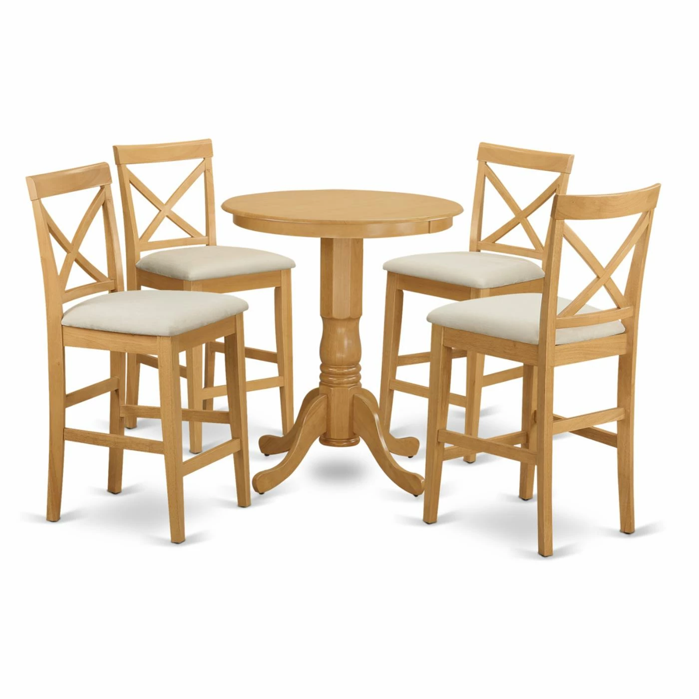 Settle around the East West Furniture Eden 5 Piece High Cross Dining Table Set to enjoy lunch or a casual drink. The round table and four chairs are compact, making them the perfect fit for smaller dining areas. The classic wooden construction boasts a bright oak finish to highlight the wood grain. Optional microfiber cushioning adds extra comfort to the chairs.