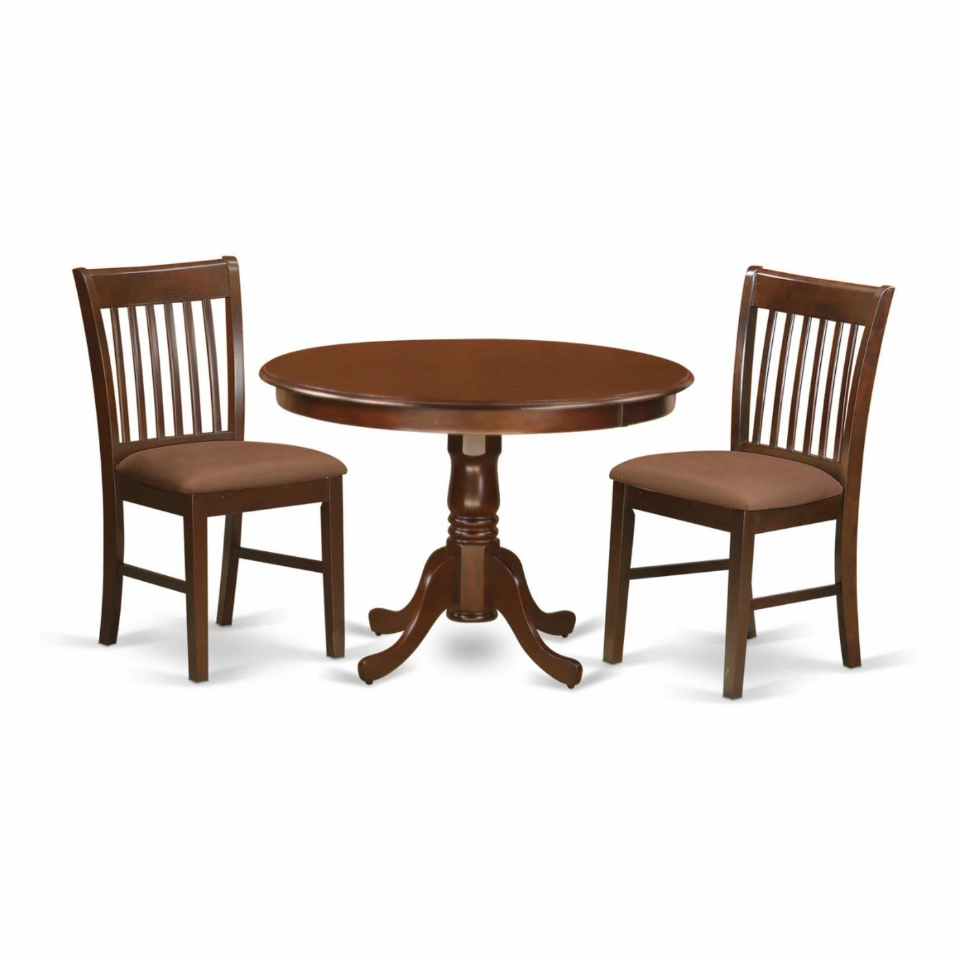 With classic profiles and rich colors, the East West Furniture Hartland 3 Piece Slat Back Dining Table Set is an effortless complement to any modern or traditional dining room design. Two chairs and a pedestal table come included in the set. Solid Asian hardwood constructs the frames, topped with a deep mahogany brown. Shapely curved feet and a turned pillar support the pedestal table. The armless chairs feature curved backrests with vertical slats. Choose your preferred seat option from the available.