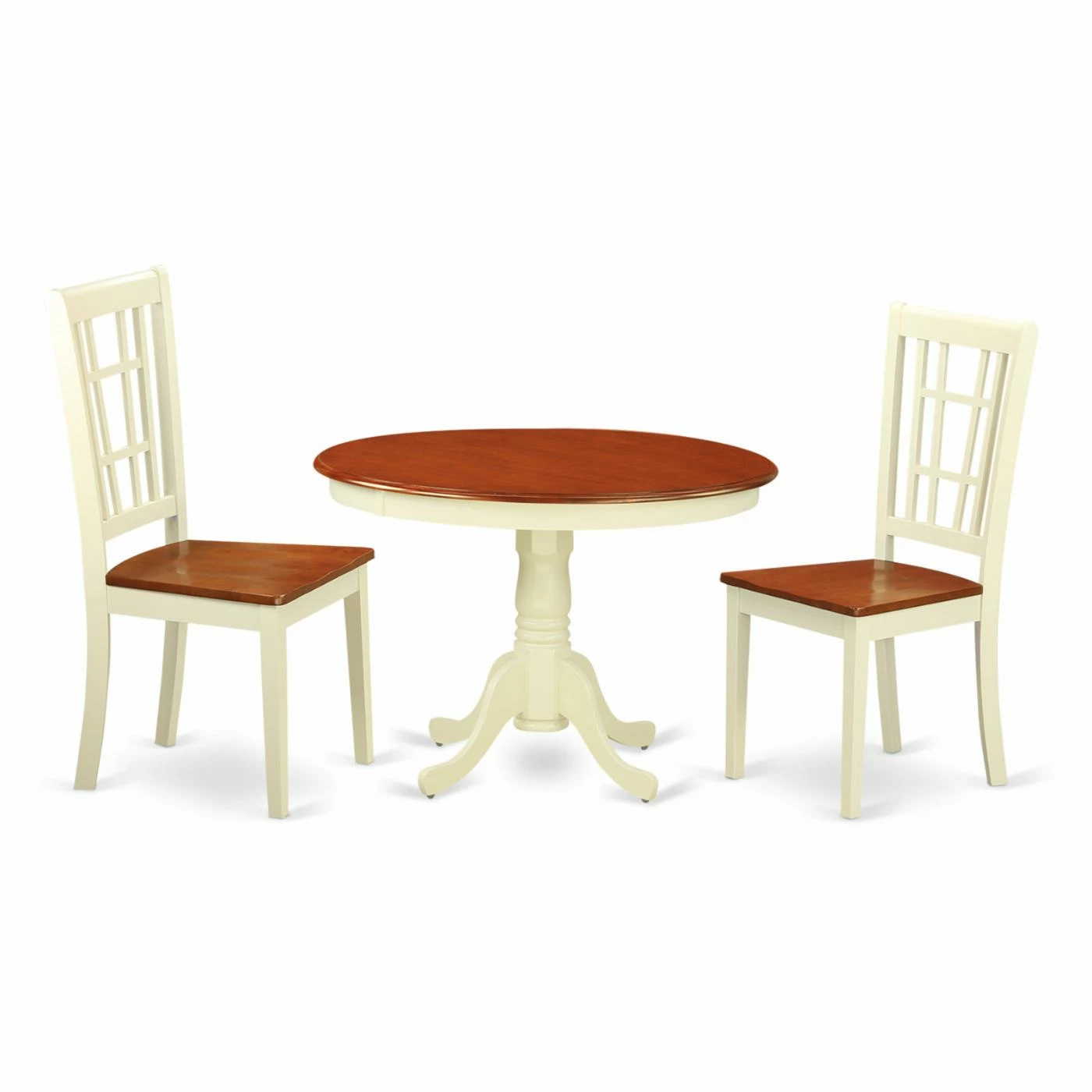 The East West Furniture Hartland 3 Piece Windowpane Dining Table Set offers your dining room or kitchen area a clean and captivating place for all your family meals. Two matching armless chairs and a round table are included in the set. Thick hardwoods construct the frames, finished in a rich buttermilk white with a gorgeous cherry finish on the tabletop and seats. Each chair features an open window-pane slat design on the backrests. Curved feet and turned accents detail the table’s pedestal base.