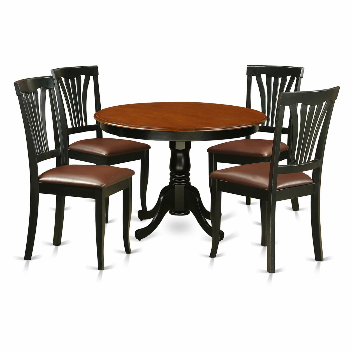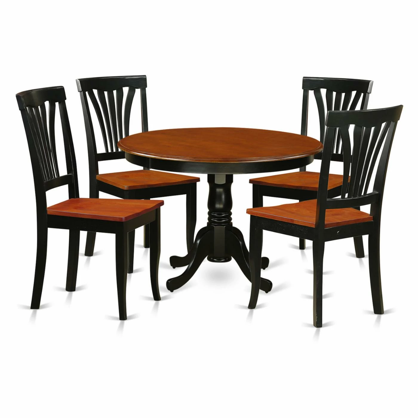 The East West Furniture Hartland 5 Piece Lath Back Dining Table Set offers a charming and cozy seating set to pare out your new dining room or kitchen design. Four armless chairs and a round pedestal table come included in this set. Each piece is crafted from high-quality hardwood and finished in your choice of available color option. Turned details and curved legs accent the table base while the chair-backs boast a fanned lath design. Select your seating option from the available.