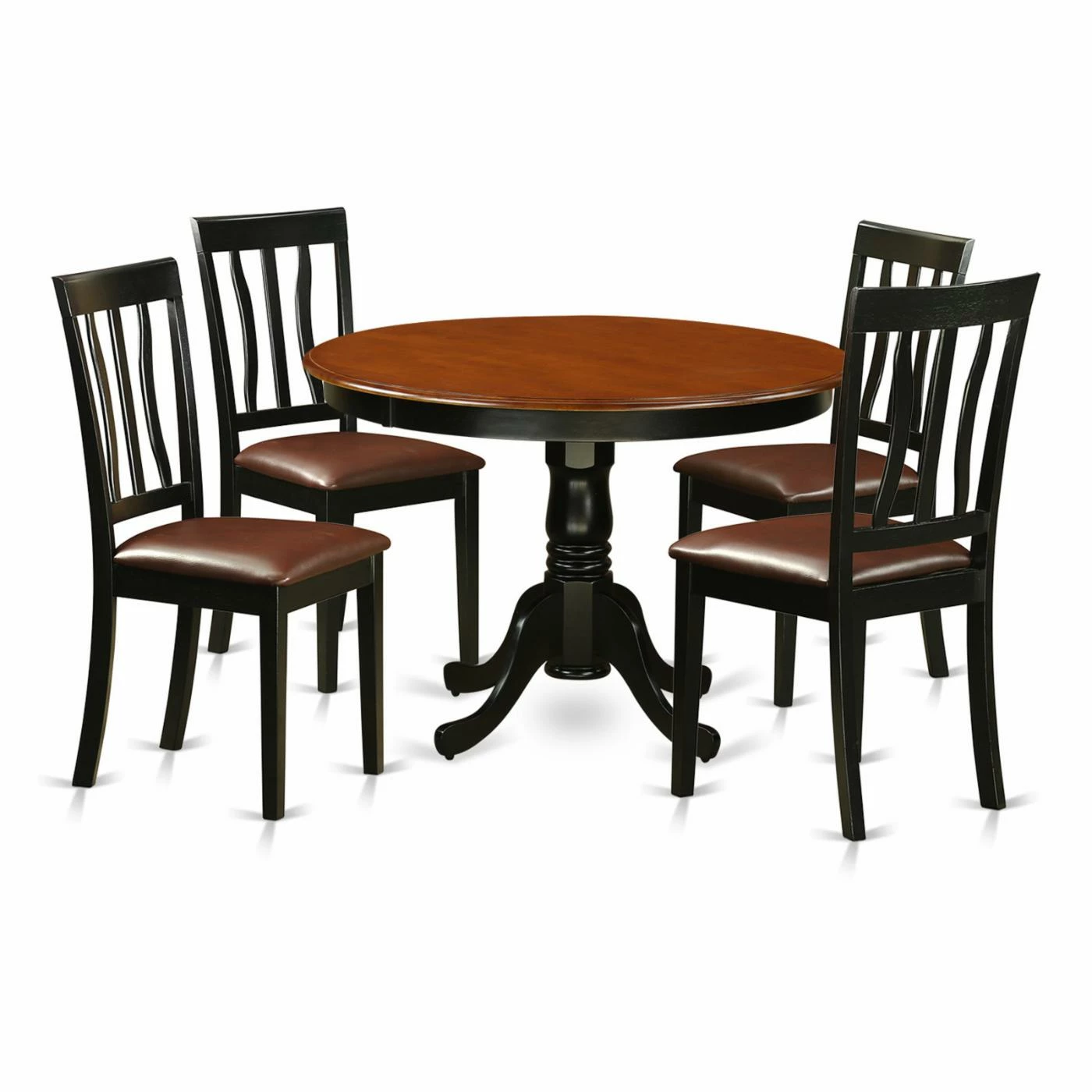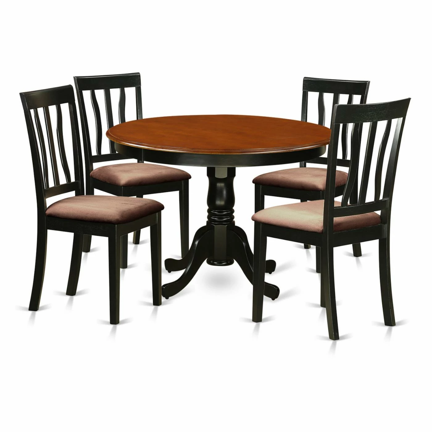 For dinettes and smaller dining rooms, there’s no better option than the East West Furniture Hartland 5 Piece Splat Back Dining Table Set. This set has a number of options that suits modern and classical decors alike. The round table features a carved pedestal base with curved legs. Each of the four chairs has block legs and an armless back with curved splat-back slats. Thick hardwood solids construct the frames, finished in your choice of available color. Select your preferred seat option from the available as well.