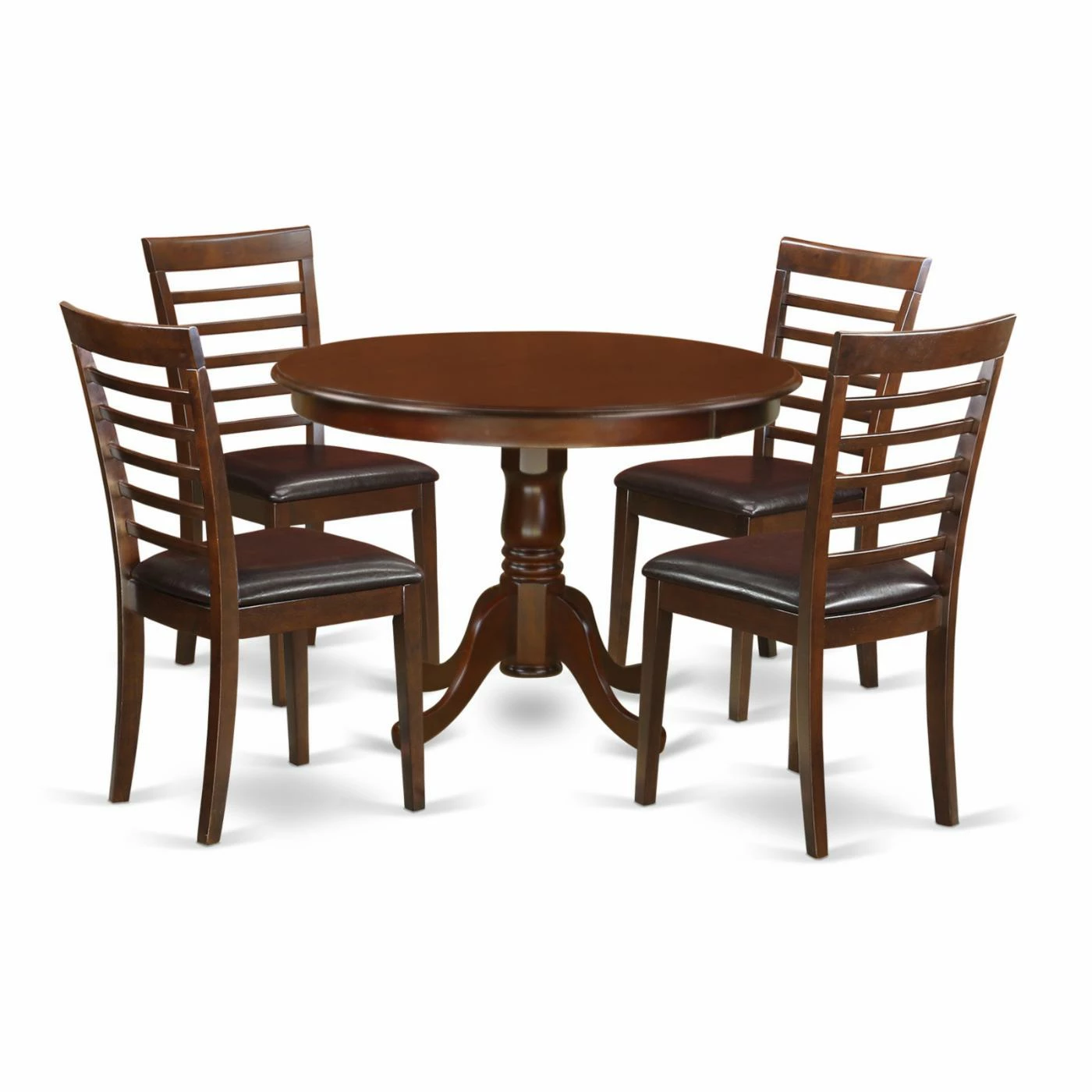 Bring home the East West Furniture Hartland 5 Piece Straight Ladderback Dining Table Set for a dining set that easily matches both modern and classical decors. A round pedestal table and four chairs come included in this set. Solid Asian hardwoods construct the frame, topped by a delicious mahogany brown finish. The chairs boast curved backrest with ladder slats and block legs. Turned accents detail the table’s pedestal base, which also features curved feet. Choose your desired seat option from the available.