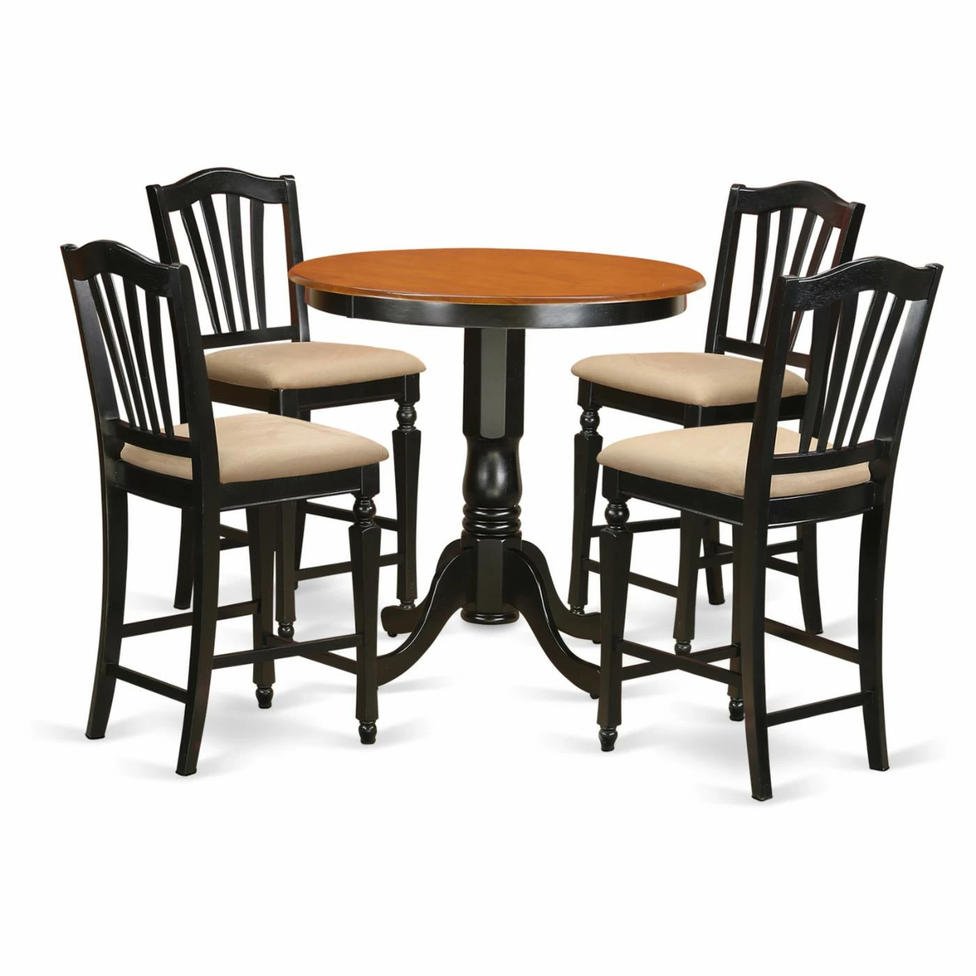 The East West Furniture Jackson 5 Piece High Splat Dining Table Set showcases a bevy of traditional style elements, perfect for any small space. The tables and four chairs in this set boast solid rubberwood construction. Spindle craftsmanship is evident in the front legs of the chairs and the pedestal base of the table. Choose from multiple seat styles to ensure comfy, supportive seating. This dining set is offered in your choice of available finish.