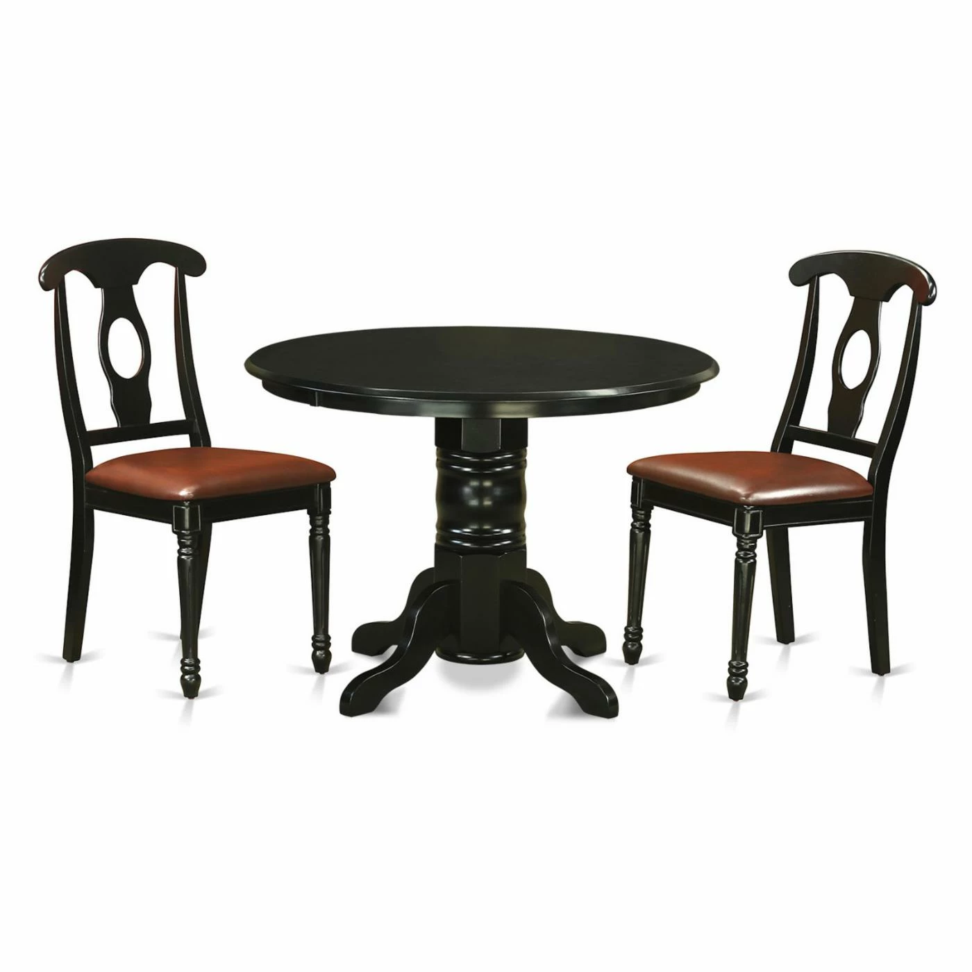 A compact footprint meets elegant style with the East West Furniture Shelton 3 Piece Keyhole Dining Table Set. Ideal for transitional or modern dining spaces, this compact dining set includes a round table and two chairs. The table’s turned pedestal base complements the turned front legs and keyhole backs on the chairs. The black finish pairs perfectly with the brown faux leather upholstery on the seats, and this dining set is crafted of 100% Asian hardwood using no laminate, veneer, fiberboard, or MDF, and the result is exceptional durability.