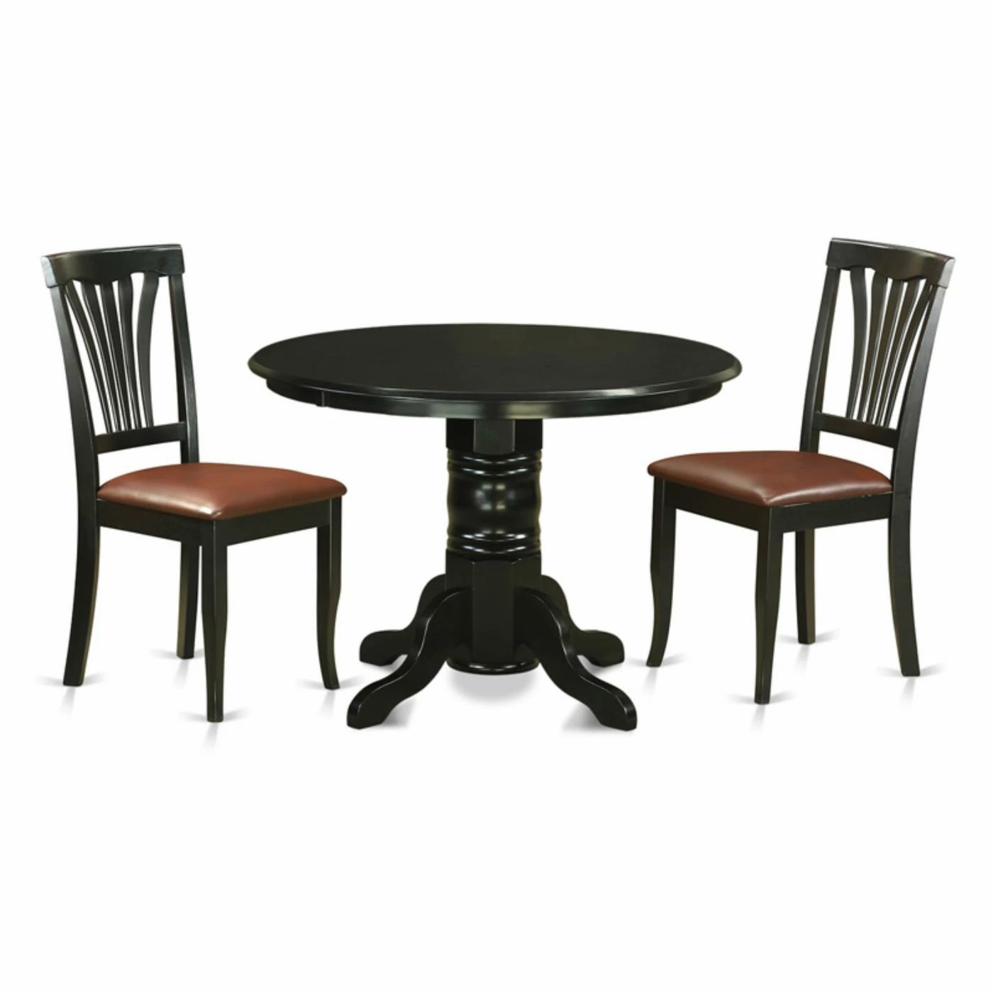 Home feels even more like home with the East West Furniture Shelton 3 Piece Lath Back Dining Table Set. Great for kitchens, small dining rooms, and more, this dining set includes a round table and two chairs. Each piece is crafted of 100% Asian rubberwood using no MDF, veneers, or laminate for the best in durability. The black finish complements the brown faux leather upholstered seats, and the open backs have a lath-style design. The dining table can seat up to four with the included extension.