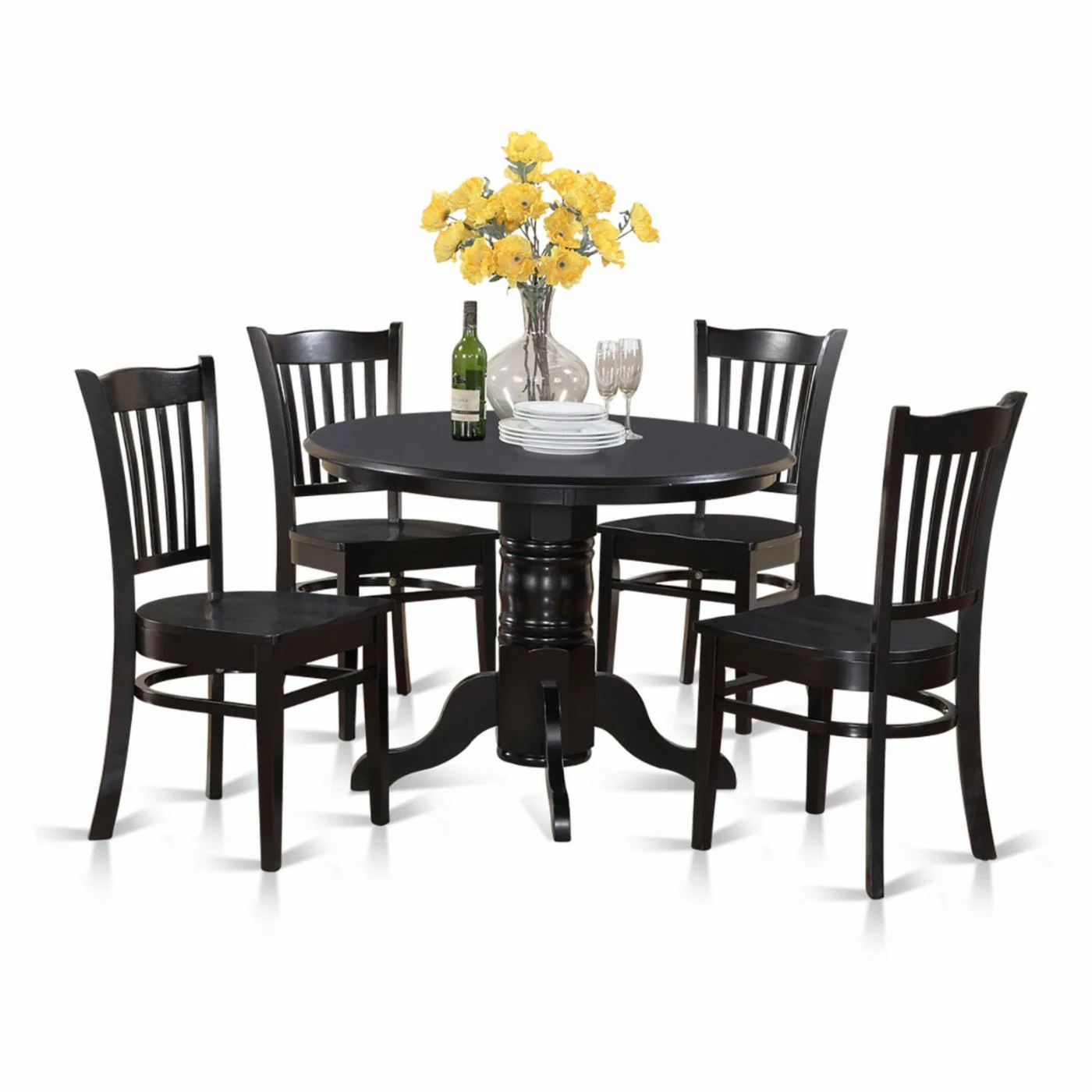 Even the leftover lasagna looks pretty elegant when you’ve got the East West Furniture Shelton 5 Piece Comb Back Dining Table Set in your kitchen or dining room. With a versatile style that fits everything from modern to traditional dΓ©cors, this dining set includes a round table with a turned pedestal base as well as four chairs. The vertical slat chair backs combine with your choice of seat type. A black finish graces the 100% Asian hardwood, which uses no MDF, veneers, or laminate in its construction for superior durability.