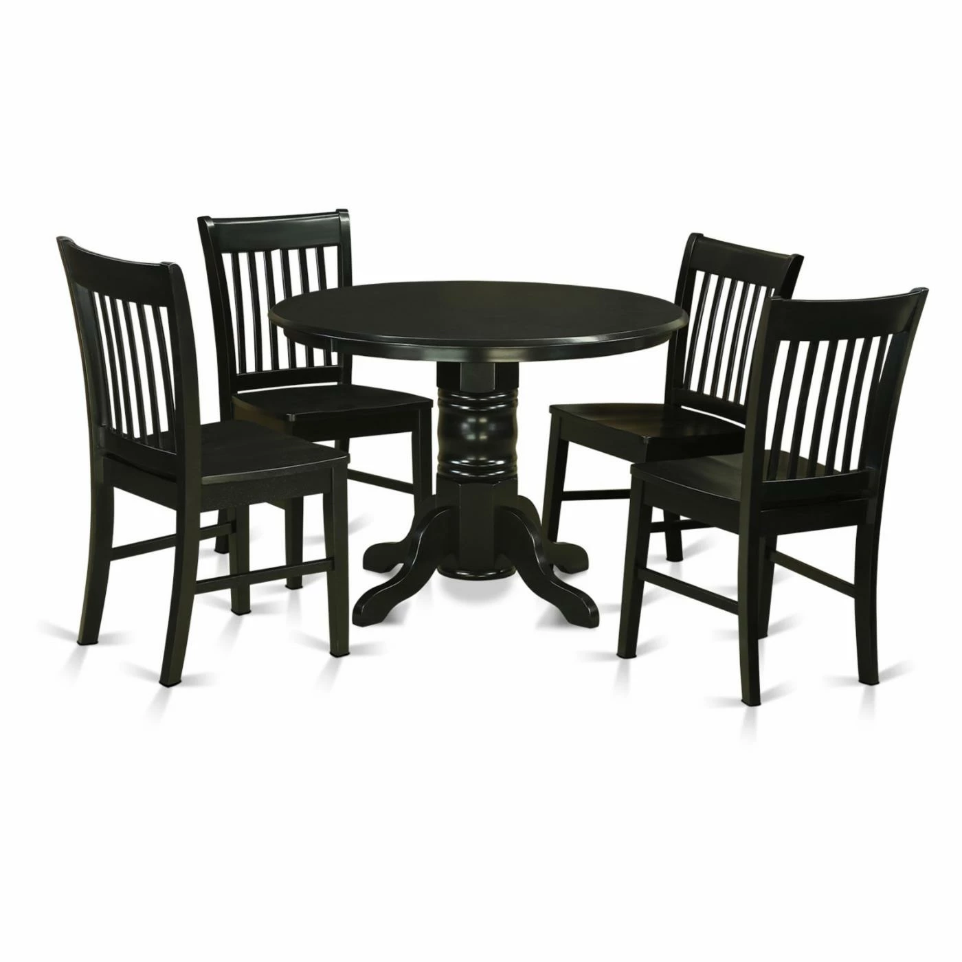 From home-cooked breakfast to Friday night takeout, the East West Furniture Shelton 5 Piece Slat Back Dining Table Set sets an inviting scene for all your meals. Right at home in transitional, traditional, and modern dΓ©cors, this versatile dining set includes a round table with turned pedestal base and four chairs with classic vertical slat backs. The black finish coordinates with a variety of palettes, and each piece is crafted of 100% Asian hardwood using no MDF, veneer, or laminate.