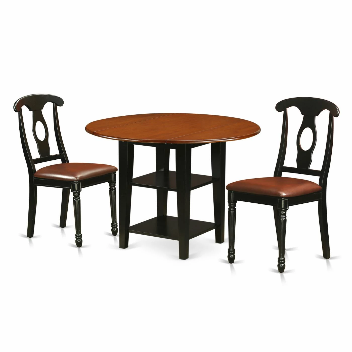 Get that modern farmhouse look in your small dining space with the East West Furniture Sudbury 3 Piece Dual Drop Leaf Dining Table Set with Keyhole Chairs. The style starts with the two included chairs that are graced with keyhole backs and turned wood legs. Customize your comfort by choosing from the available seat types. The round table included with this dinette set features two drop leaves, which means you can drop the leaves to save space or extend them to seat up to four. Two integrated shelves below offer room to display your personality. This dinning set is well-crafted of solid rubberwood and offered in your choice of available finish options.