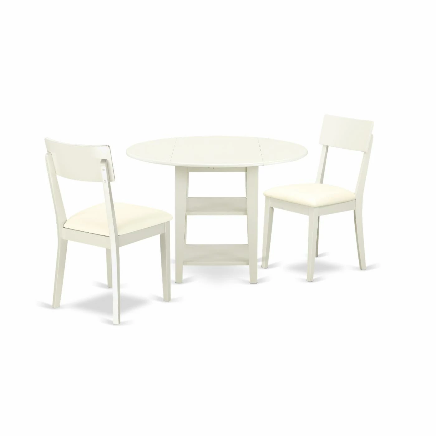 An ideal small-space set, the East West Furniture Sudbury 3 Piece Extension Dining Table Set – Linen White folds up small when needed and offers display space, too. To ensure a good match to nearly any home, the set features clean, mid-century lines and is finished in a bright linen white. Chairs boast open backs and generous seats that are upholstered in a white faux leather. The smart table offers two fixed open shelves for storage or display, plus two drop leaves that extend it to seat four.