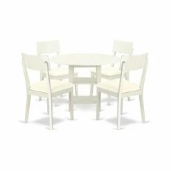 To make the East West Furniture Sudbury 5 Piece Dual Drop Leaf Dining Table Set – Linen White ideal for your small dining space, it features a drop-leaf table with storage shelving. Clean, mid-century lines and a linen white finish ensure this dinette set will match your home handsomely. The ingenious table offers two fixed open shelves for storage baskets or display pieces, plus two drop leaves that extend it to seat four. Chairs have open backs and generous seats that are upholstered in easy-clean white faux leather. Pieces in this set are well-built of solid rubberwood for lasting beauty.