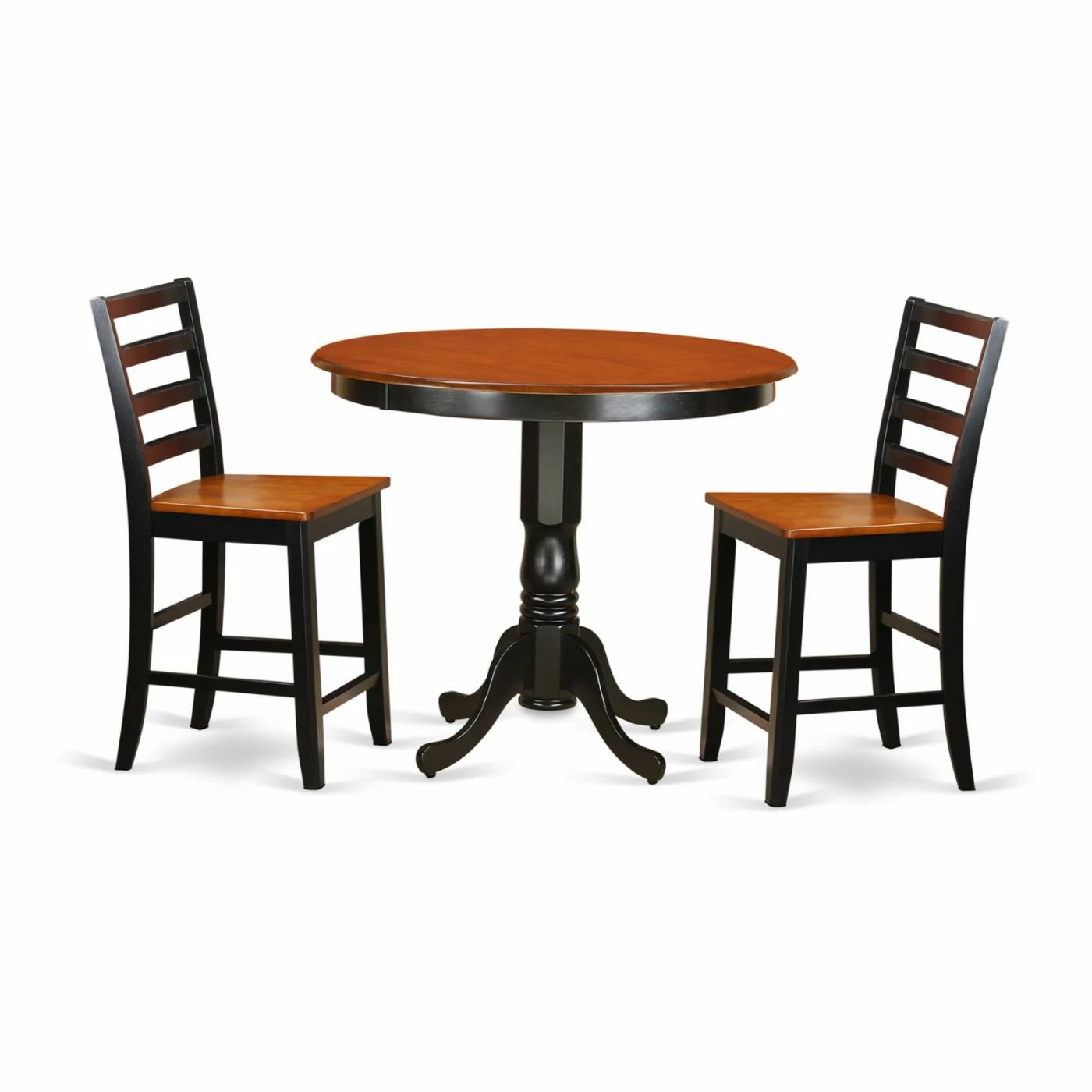 The East West Furniture Trenton 3 Piece Ladder Back Dining Table Set is a conveniently compact and elegant addition to any tiny kitchen or dining room. Solid Asian hardwood construction ensures this set is will look stunning and last. The chairs are equipped with supportive slat backs as well as cushioned seats with soft microfiber upholstery. The black finish adds a streamlined element to this dining table set.