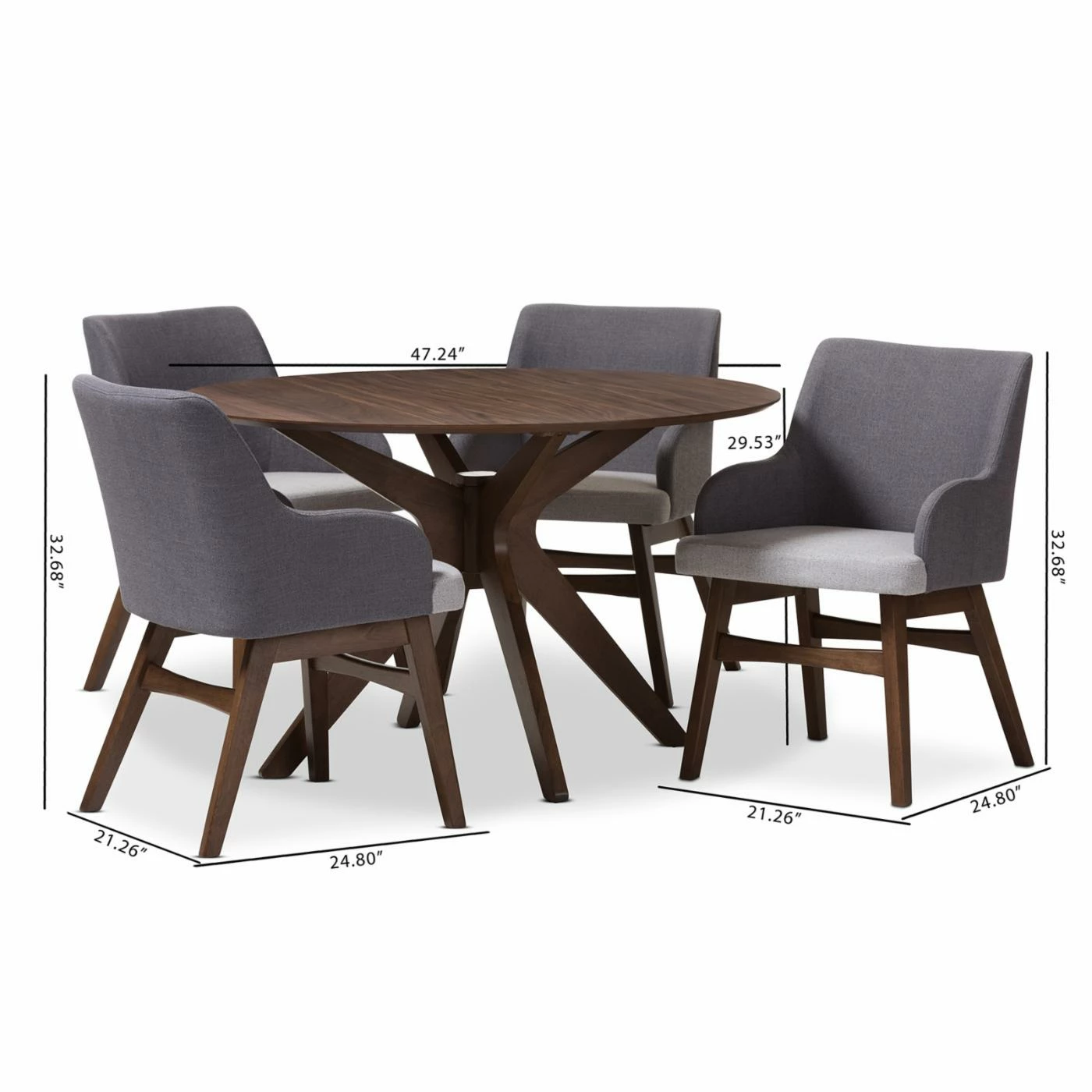For a comfortable dining room with chic mid-mod style, choose this HN Home Devey Mid-Century Modern 5 Piece Dining Set. This dining set includes a round dining table with angled, flared legs that form a pedestal base and four chairs with mid-century frames. Pieces in this five-piece dining set are crafted from rubberwood solids and wood veneers in a versatile walnut finish. Chairs are upholstered in soft, easy-care polyester in charcoal gray with light gray seats.