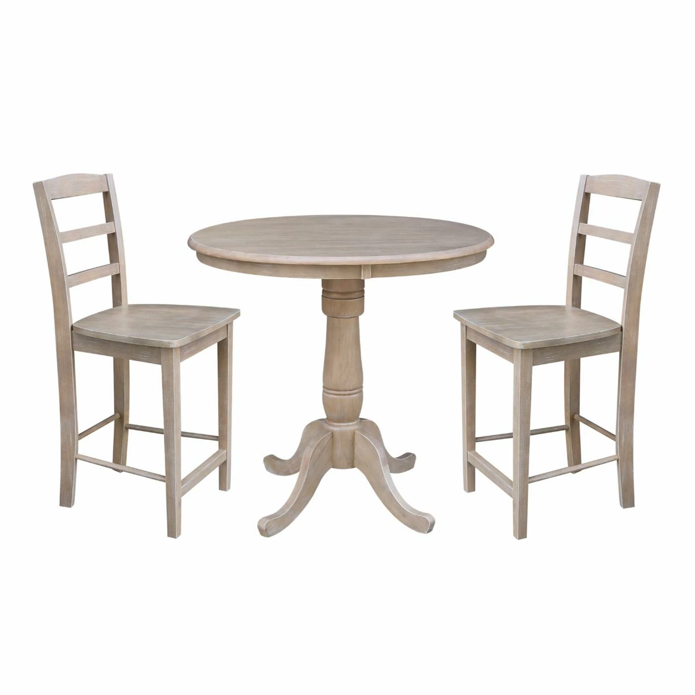 Your small dining space will thank you after you bring the International Concepts 3 Piece Counter Height Dining Set home. This classic set features a table and two matching stools made from solid wood with a butcher block surface and gray finish. The table sits on a pedestal base with four feet while the stools have box seats.