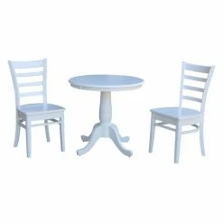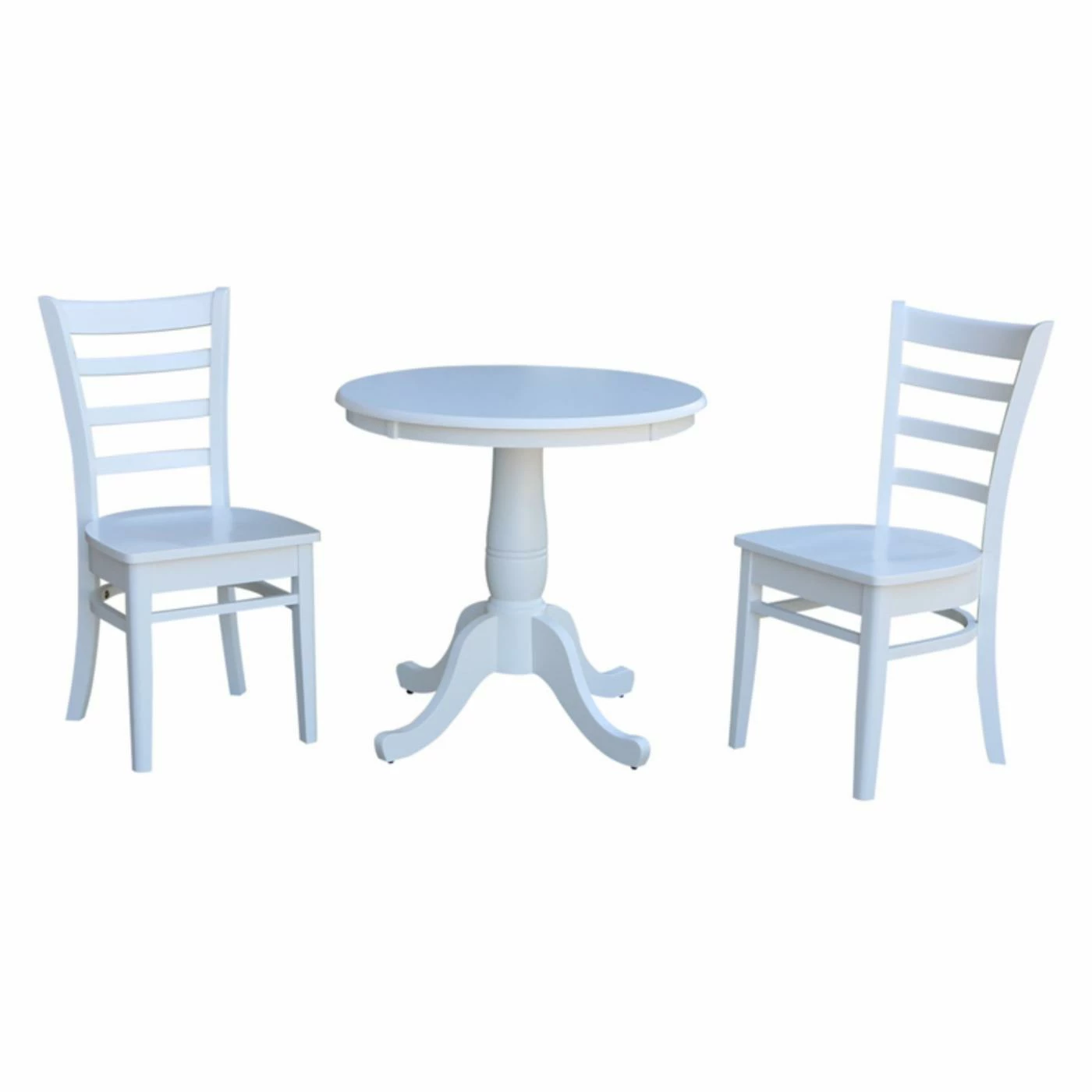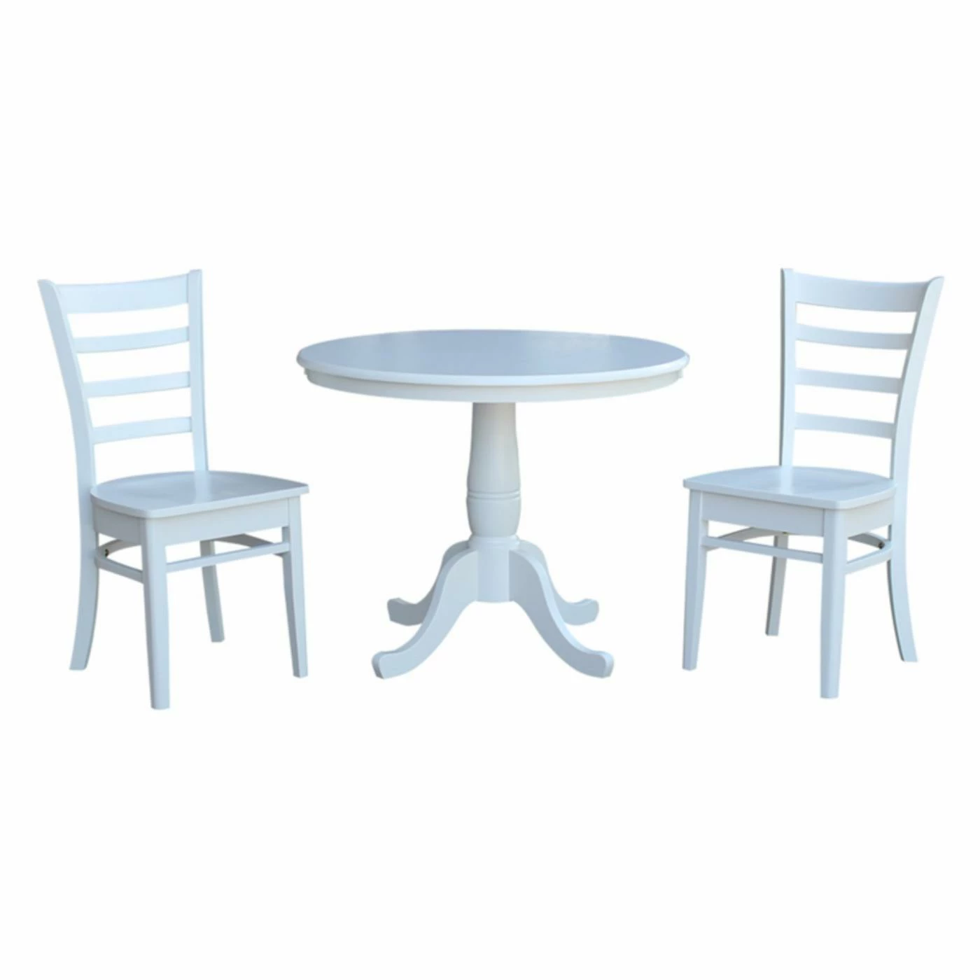 Deliver a quality look to your eating area with the International Concepts 3 Piece Dining Set with 2 Emily Chairs. This beautiful dining set includes a traditional round table with a sturdy pedestal base and two classic ladder-back chairs. The bistro style is perfect for small spaces such as apartments or kitchen areas. All pieces are expertly crafted using solid hardwood and finished in white for a fresh, versatile design.