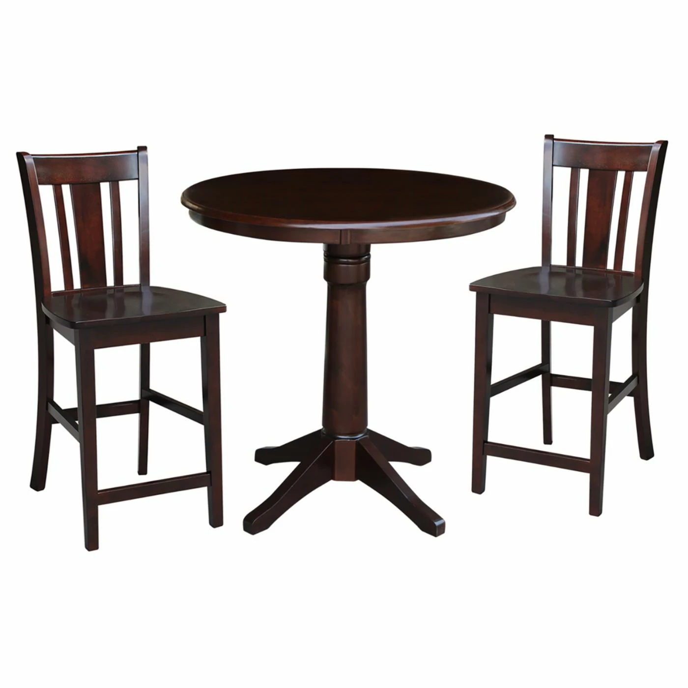 You can find an average table at any big-box store or furniture outlet, but you’ve already found the International Concepts Straight Pedestal Counter Height Dining Table Set with 2 San Remo Chairs, so why would you keep looking? This set includes a pair of chairs with a matching table. Each piece is crafted from solid hardwood with a multi-step finish in a deep shade of brown. Vertical slat chairs with contoured seats gather around a pedestal table with a simple, almost Shaker-inspired design. The round table offers up a butcher-block top on a tapered pedestal that stands on four feet. Each seat is built with box construction for a robust design that’s ready for years of use. Choose from the available finish options.