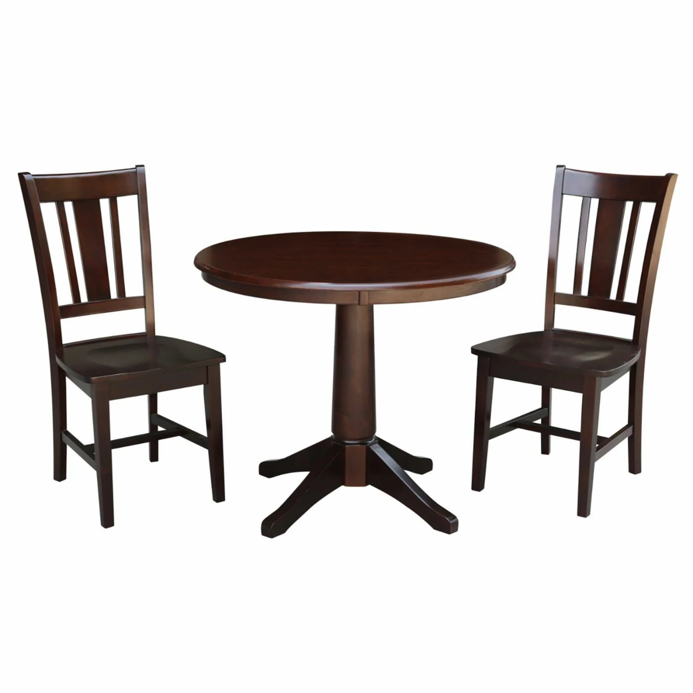 When it’s time to set the table, you might want to snap some Instagram photos so you can show off the International Concepts Straight Pedestal Dining Table Set with 2 San Remo Chairs. This set includes a pair of chairs with a matching pedestal table. Each piece in this set is made from solid hardwood with a multi-step finish in a rich shade of traditional brown. The chairs offer the comfort of contoured seats with a curved backrest that incorporates vertical slats. The table has a butcher-block top with a shallow apron, and it’s supported by a thick pedestal of lathe-turned hardwood. The carved details of the pedestal add a touch of elegance while the four-footed design provides a stable base on any surface.