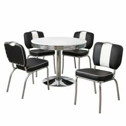 Retro-style dining comes easy with the Target Marketing Systems Raleigh 5 Piece Dining Table Set. Gleaming chrome accents the round pedestal base and the tubular chair legs. Two-tone faux leather seats are downright exciting. A laminated white finish coats the durable engineered wood table top.