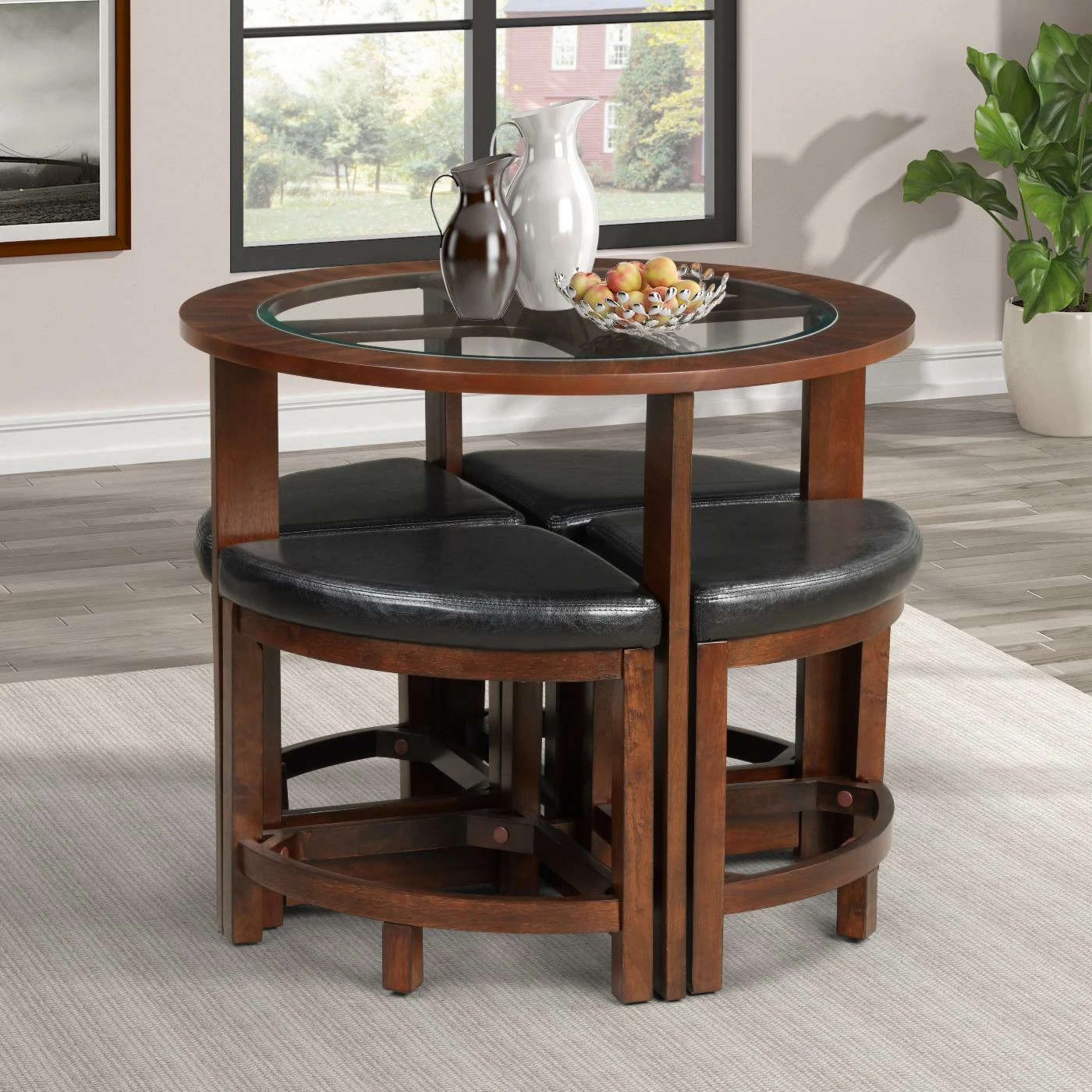The Roundhill Furniture Cylina Glass Top Round Dining Table with 4 Chairs is ideal for smaller spaces. This dining set is designed with streamlined, flowing lines and a dark brown finish. It’s crafted of sturdy, durable wood and boasts a clear glass table top. The triangle-shaped chairs feature a backless design and leather-like upholstery. For easy storage, the chairs fit neatly under your table when not in use.