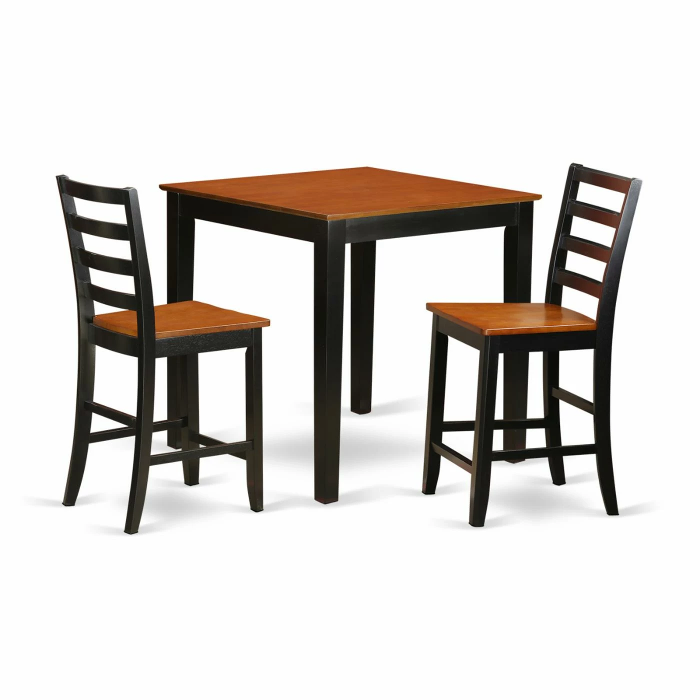 The East West Furniture Pub 3 Piece Ladder Back Dining Table Set combines sleek Asian hardwood construction with elegant looks. The chairs and table of this dining set are designed to last and sport a smooth black finish. The seats of the chairs are padded and upholstered in rich leather. Ladder backs ensure stylish support.