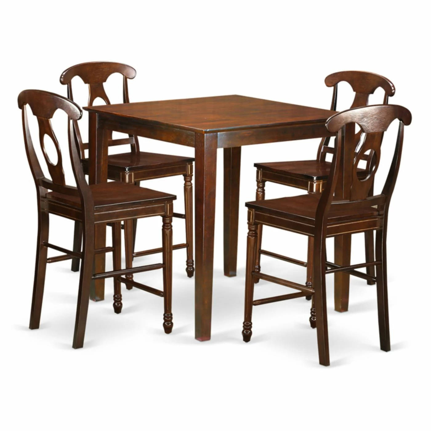 The East West Furniture Vernon 5 Piece Keyhole Dining Table Set is a sleek, streamlined, and practical addition to any small dining space or kitchen. The table and chairs are crafted of quality Asian hardwood for lasting use. Keyhole backs on the chairs add support and eye-catching interest. This dining set is offered in your choice of available finish options.