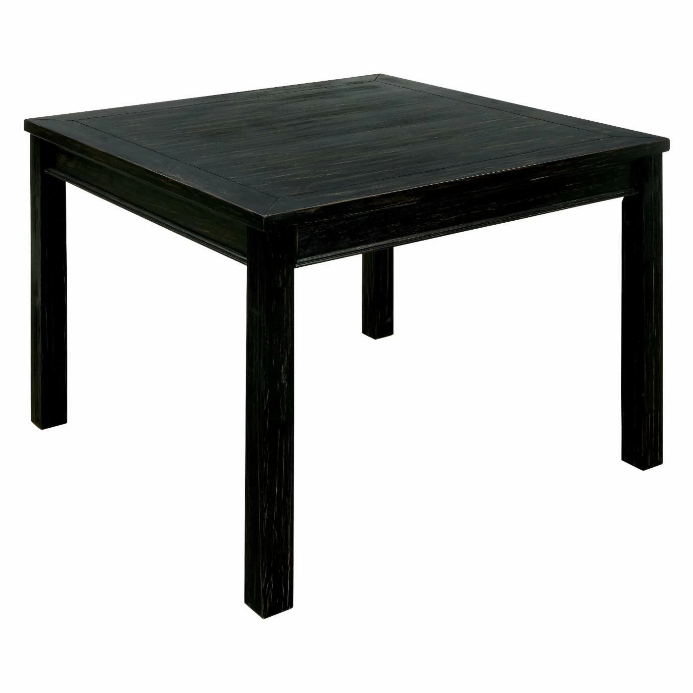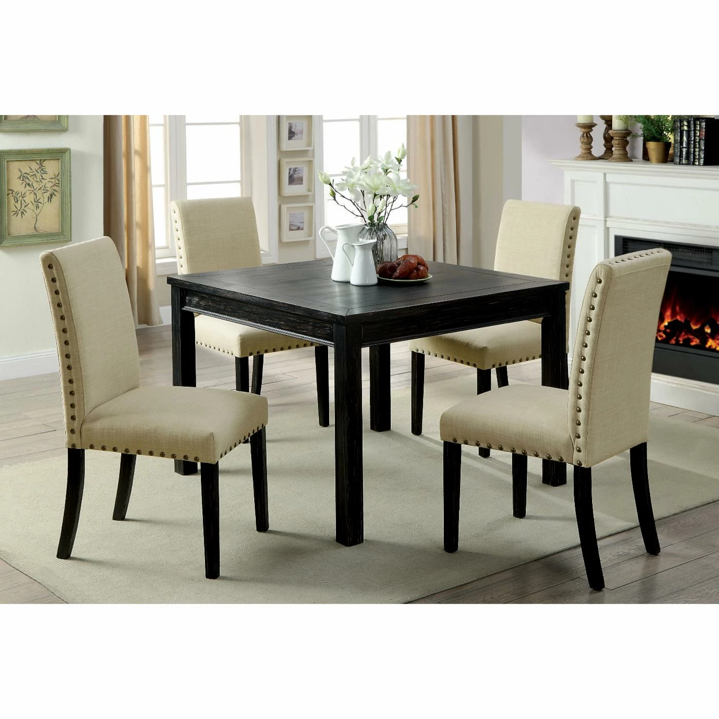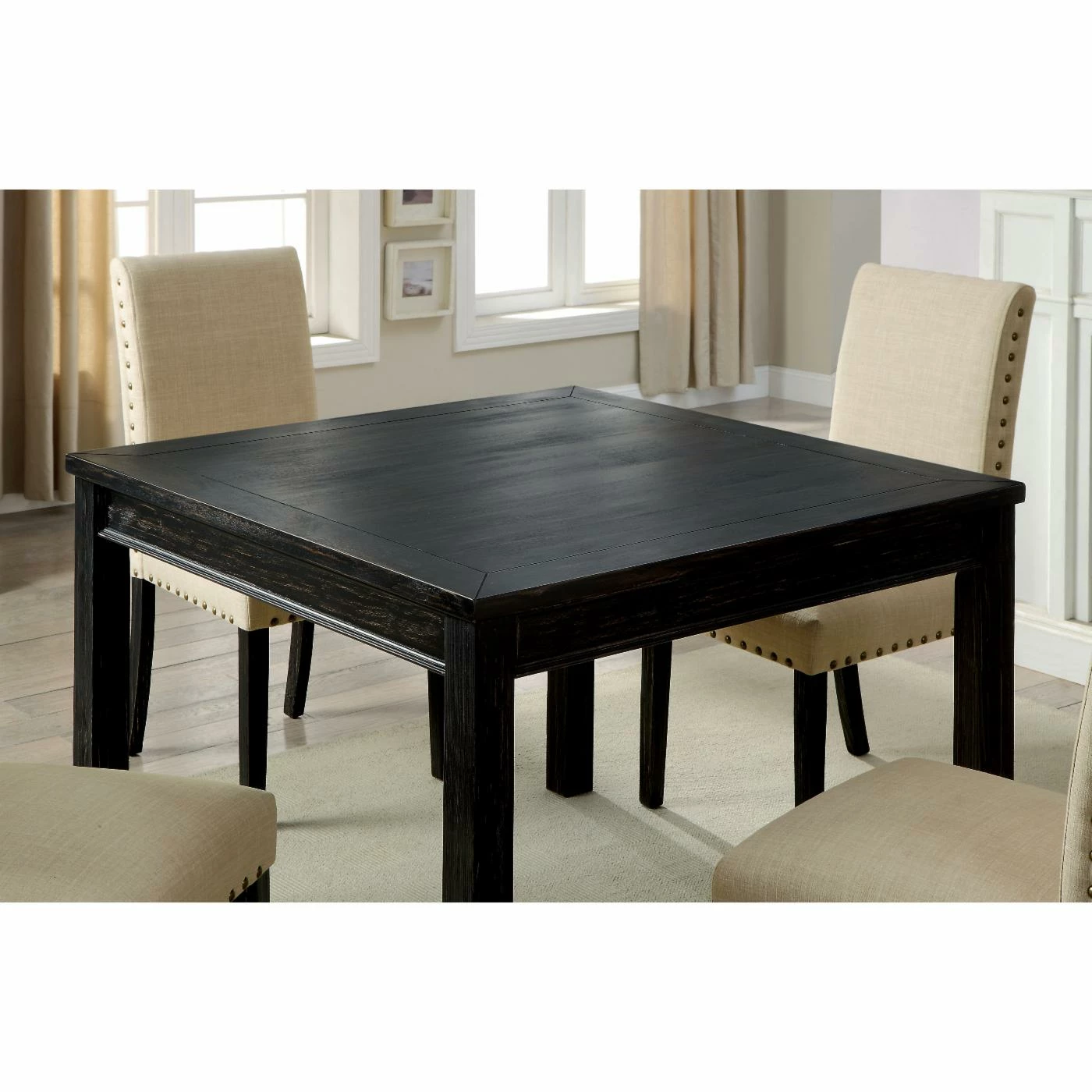 The Furniture of America Verdugo 5 Piece Rustic Dining Table Set comes with four armless, padded chairs. They’re upholstered with a taupe, linen-style fabric and have nail head embellishments lining the edges. The square-top table has thick boxy legs that enhance its sturdy look, and it boasts a rugged, distressed appearance that’s elevated by the antique black finish. This set is an excellent way to add a designer look to a rustic theme.