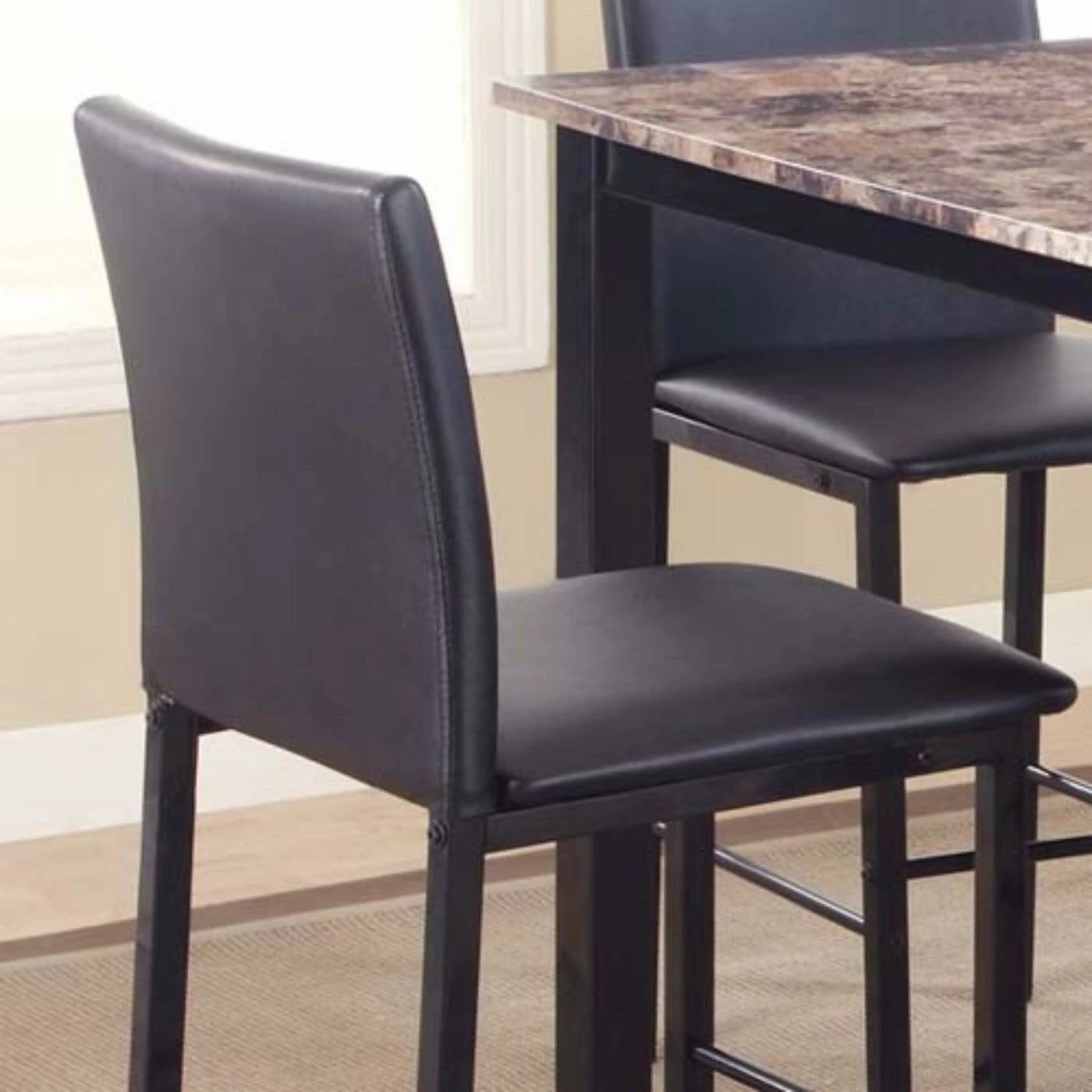 The Roundhill Furniture Citico 5 Piece Counter Height Dinette Set is ideal for smaller spaces such as an apartment or breakfast nook. This dinette set is made to last, crafted of sturdy metal with a marble-like, laminated table top and durable vinyl upholstery on the chairs. Each chair slides right up to the table with an armless design to save space when not in use and features a mid-back height for supportive comfort while you dine.