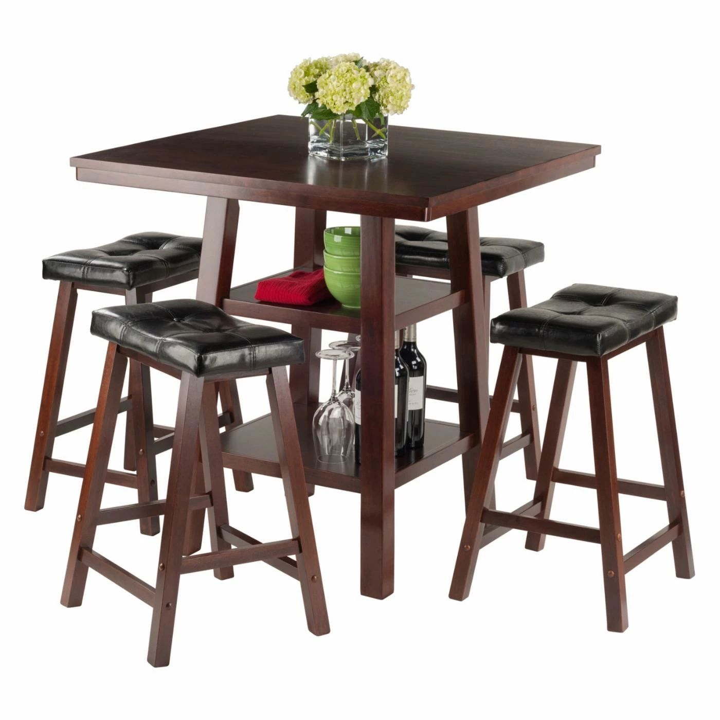 Four handsome backless stools complement this transitional pub table. The Winsome Orlando 5 Piece Counter Height Dining Table Set is a versatile ensemble crafted from solid wood and durable composite in a radiant walnut finish. This comfortable addition to your kitchen or breakfast nook offers padded faux leather seating for four and two shelves beneath its generous tabletop so you can display decorative items or conveniently store your entertaining essentials.