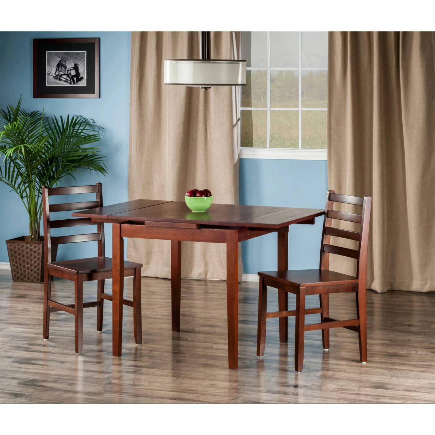 The Winsome Trading Pulman 3 Piece Dining Set comes with a drop-leaf table and two matching chairs. This dining table extends to a length of 48 inches, making room for up to four people to sit and share meals together. The chairs in this dining set feature a ladder back design and armless silhouette, giving them a look that’s charmingly simple.